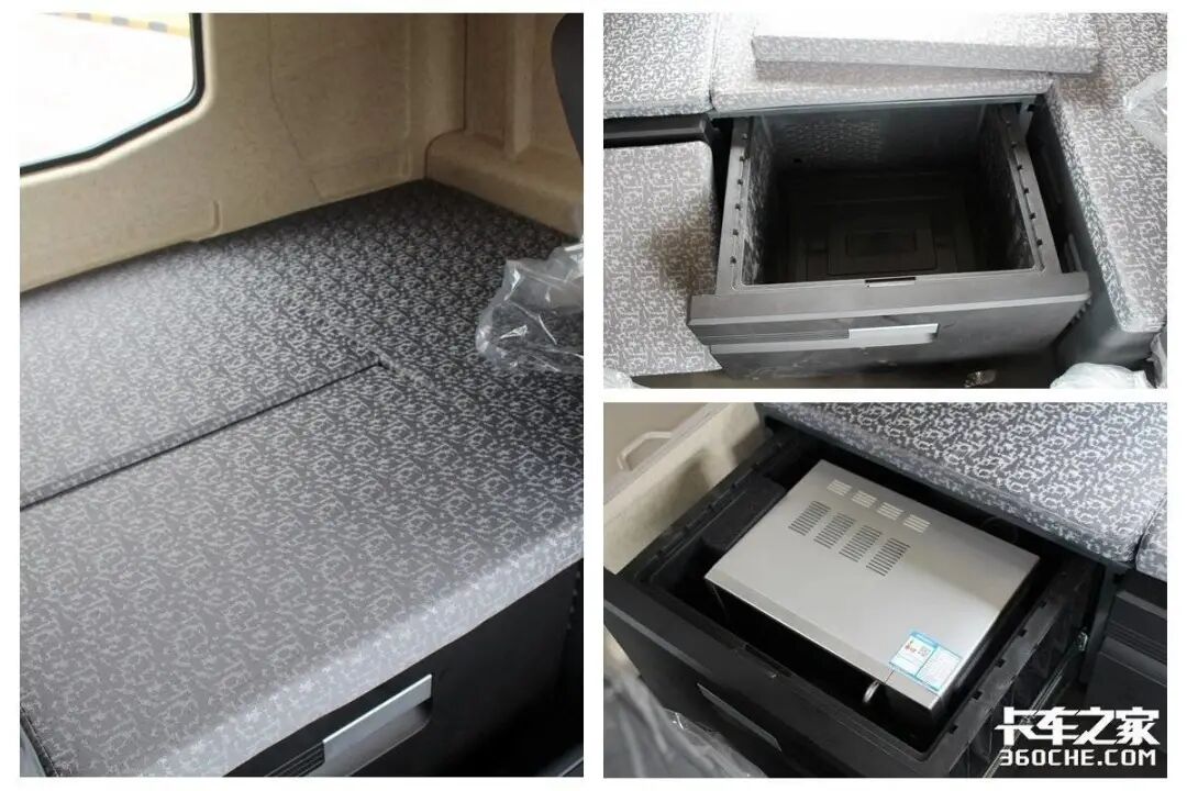 卧铺下方也是暗藏玄机,它采用了模块化的设计,配备了抽拉打开的车载微波炉和车载冰箱,方便卡友在车上携带一些饮料和食品。并且这两个配置都是标配,不加价,可以说非常良心。
