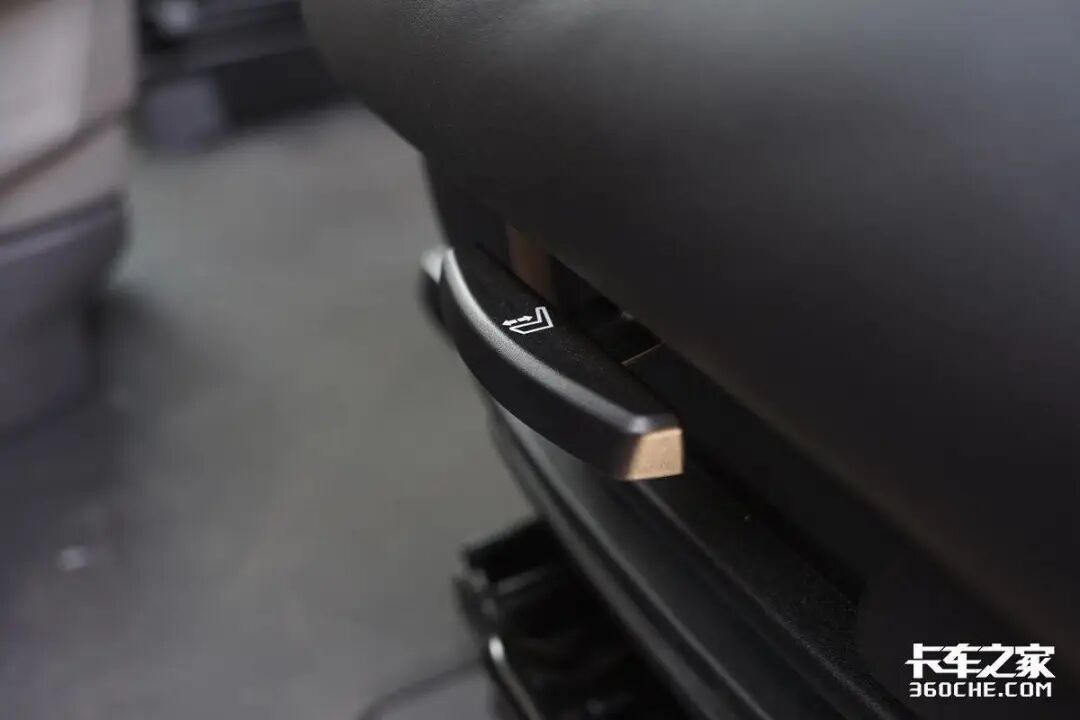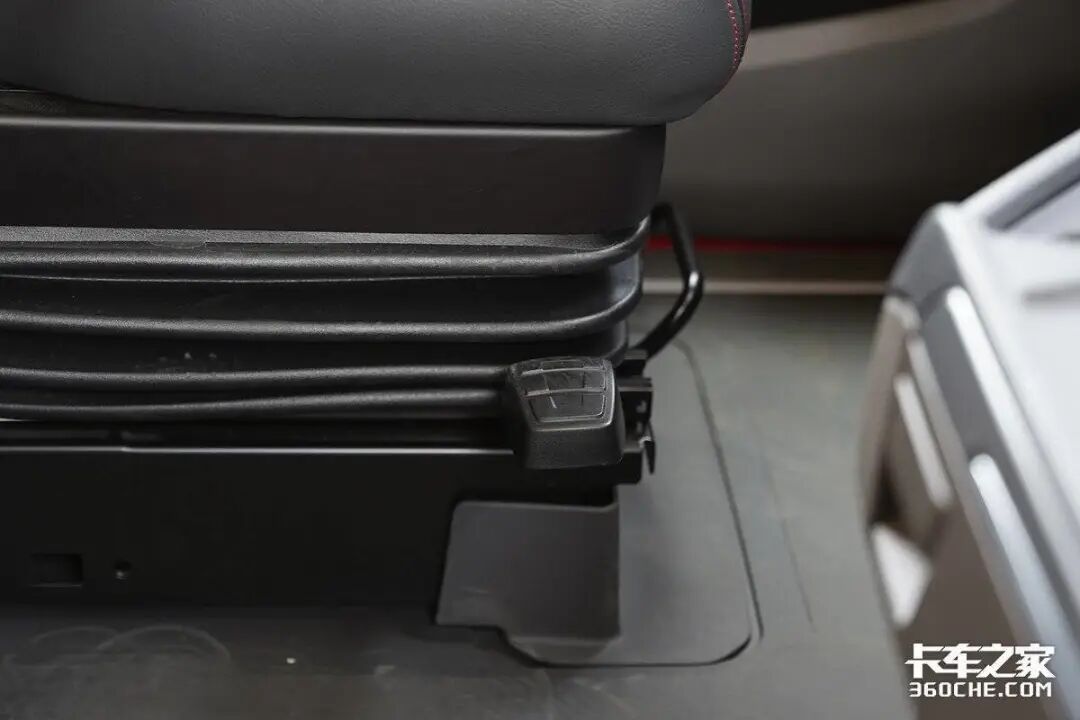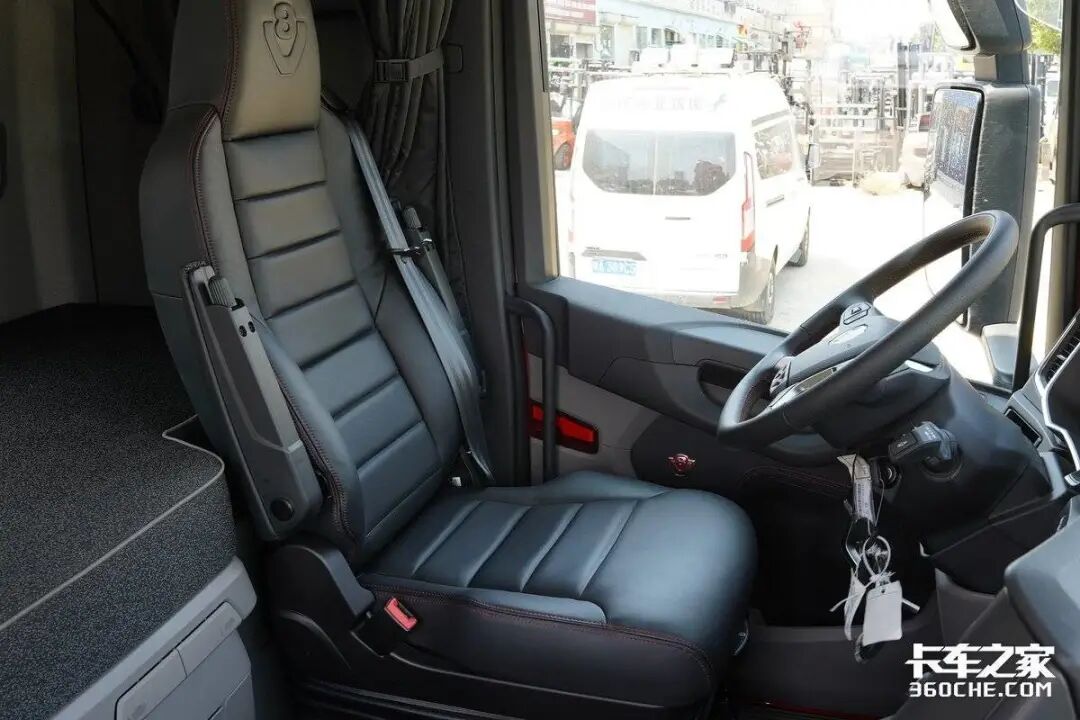 实拍的这款斯堪尼亚650S标配有全皮包裹的多功能气囊减震座椅,并且在座椅靠背处也有V8字样的标识。