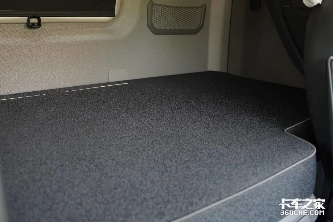 为了给到驾驶员更加舒适的休憩环境,车辆的卧铺宽度就必须要宽。上、下卧铺在原本80厘米左右的宽度上,将车座调整完毕后,还能够二次拉伸下卧铺床板,使其宽度达到1米2左右,同时,车辆标配的卧铺也是非常柔软,厚度将近有10厘米,不难想象躺上去会有多舒服!