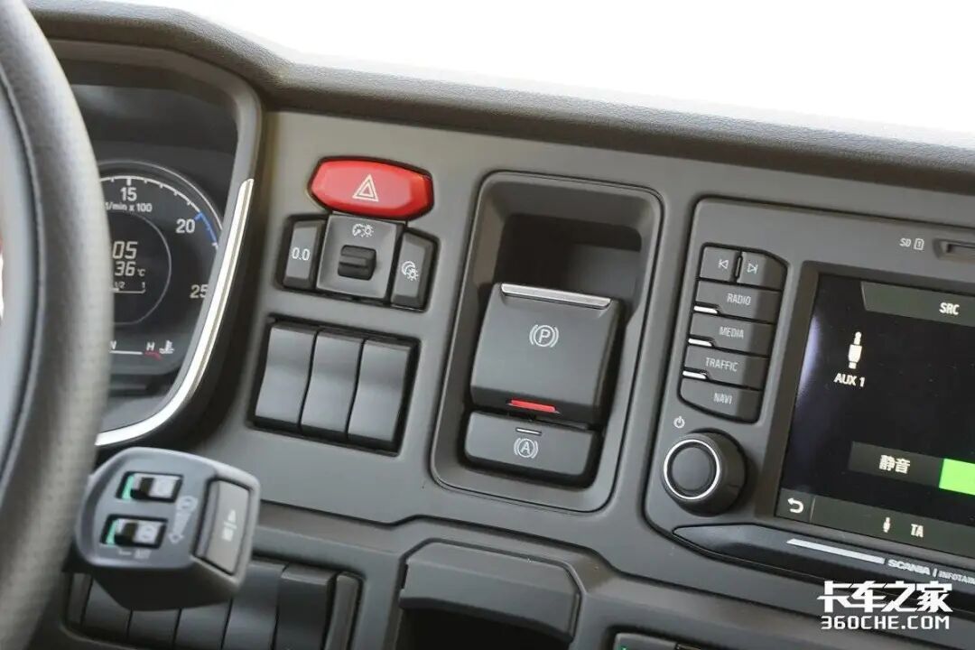 车辆的中控台采用半围绕驾驶员设计,最靠近驾驶员的模块布置有电子驻车、挂车制动开关,在功能区,斯堪尼亚650S的中控台布置有一块7英寸多媒体大屏以及自动空调系统等功能性配置。此外,在中控台下面还布置有置物架,包含有储物格、烟灰缸等实用性很强的配件。