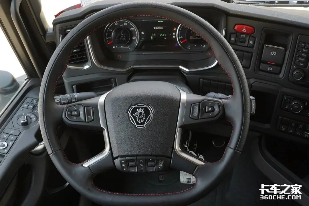 并且这款斯堪尼亚650S还装配有老司机最爱的怀挡,左侧的挡把长按控制玻璃水的按钮能够实现车灯自洁功能,右侧的怀挡可对变速箱、液力缓速器进行操作,整个车辆的操作完全通过方向盘就能实现,非常人性化。