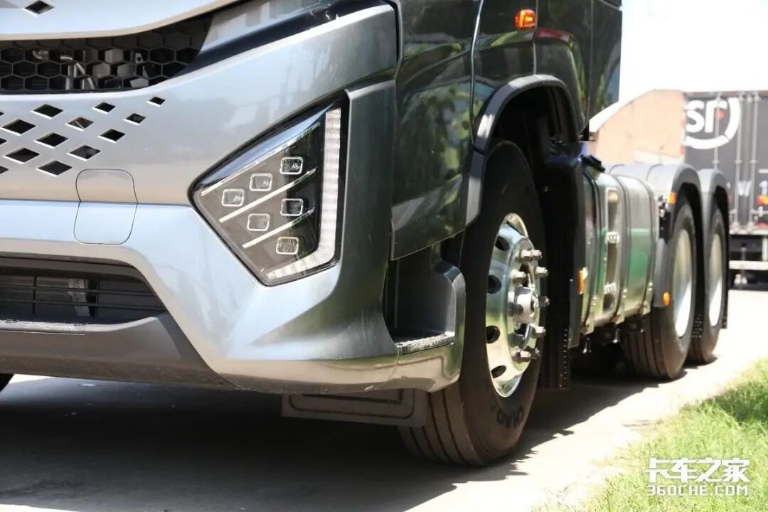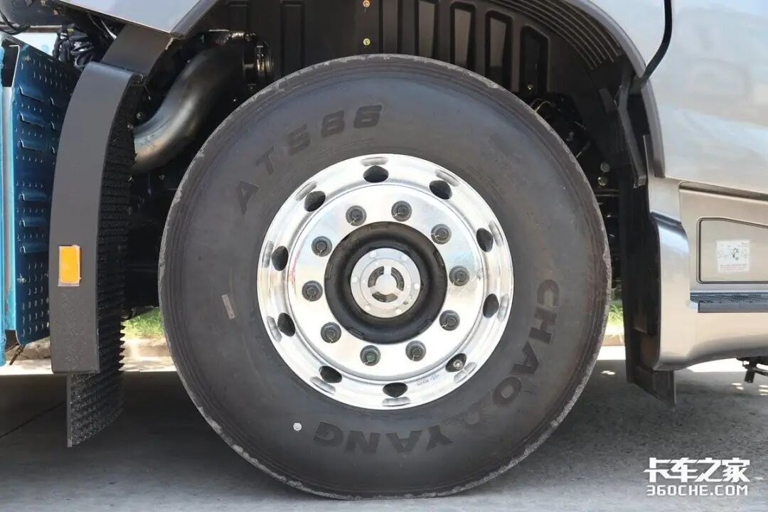 实拍车采用的是朝阳12R22.5规格的轮胎,前桥标配铝合金轮圈,此外也可选装固特异的低滚阻真空胎。此外,银河系列标配前盘后鼓的制动器,也可选装全盘式制动器。