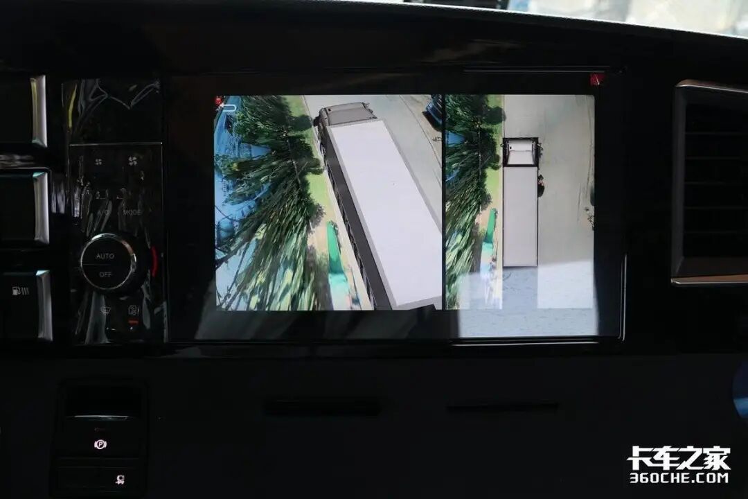 重卡车身比较长,会存在很大的视觉盲区,很多事故都是因此而发生。为了让卡友们运营更安全,银河牵引车带有360环视,驾驶员可以通过中控大屏实时掌握车辆周围的情况,并且在打转向灯时,可自动切换至转向侧的摄像头,让车辆360度无死角。
