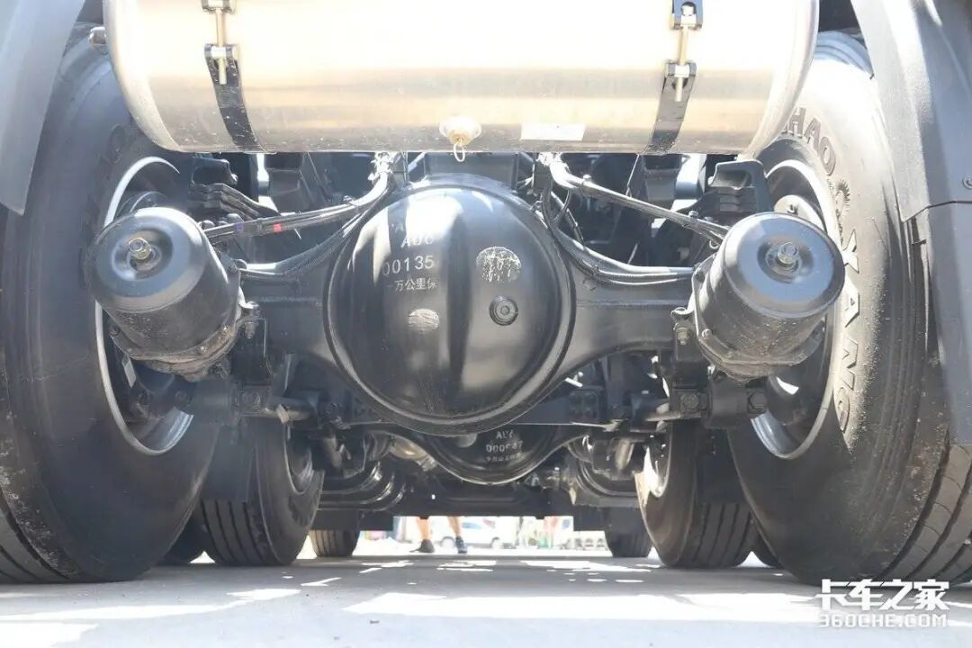 底盘承载力方面,实拍的这款银河穿越版采用的是5吨级前桥,11吨级440后桥,后桥速比有2.864、3.083等多种选择,悬架方面则采用的是如今重卡中常见的前2后3式少片簧设计。如果运输的是精密仪器、冷链等高附加值货物,想要减少行车过程中因颠簸造成的货损,也可以选择气囊悬挂。