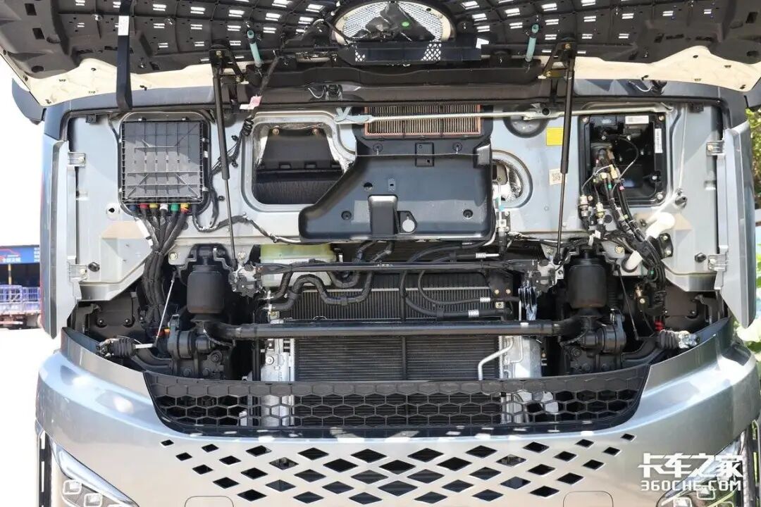 实拍的这款穿越版银河牵引车搭载的是福田康明斯X13NS6B580发动机,在1000-1400转时可爆发峰值扭矩2600N.m,排量为13L。同样福康13L发动机也采用的是非EGR技术路线,整体性能更稳定,而且带有发动机缸内制动。