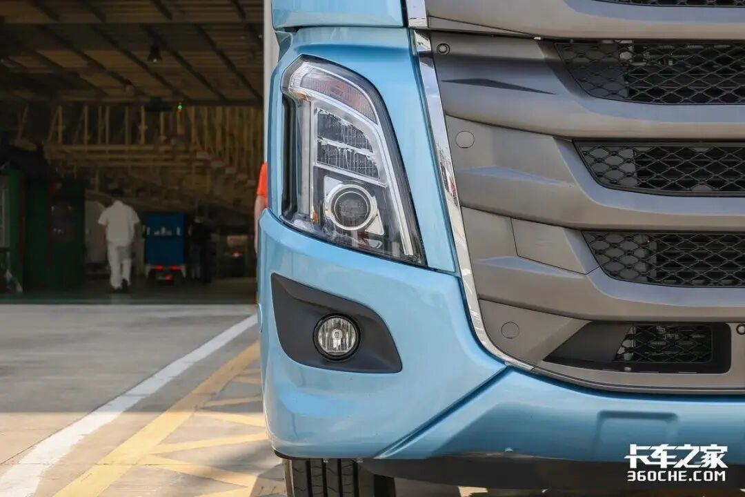 我们再看外观,这款乘龙H7的长宽高为7160mm×2525mm×3940mm,轴距为3300+1350mm,其自重控制在8.8吨。造型方面并没有太大的变化,冰晶蓝的最新涂装还是比较吸睛的,不过该车部分配置有进行升级。