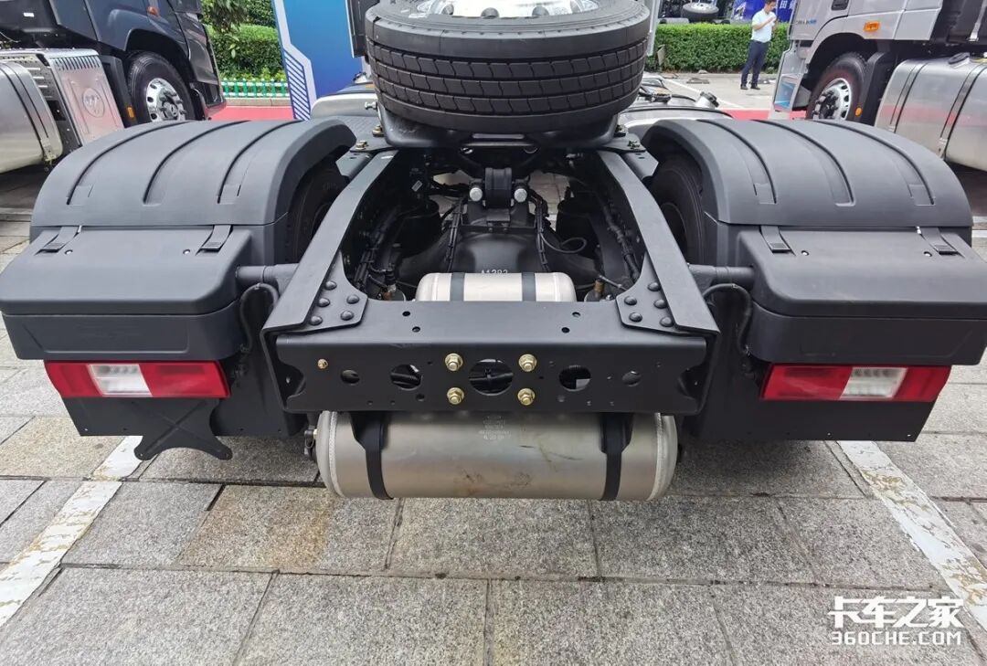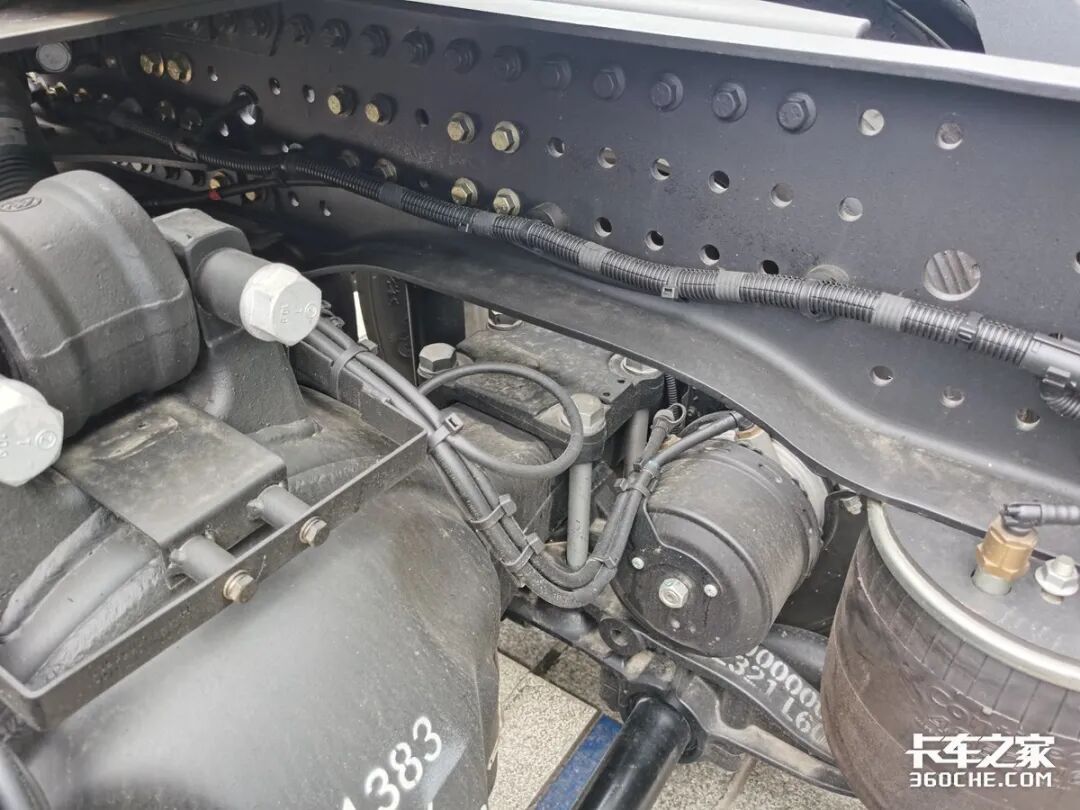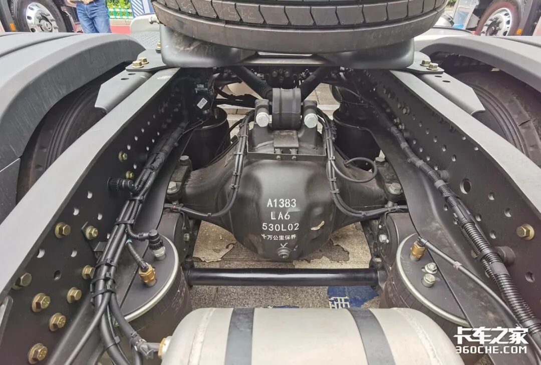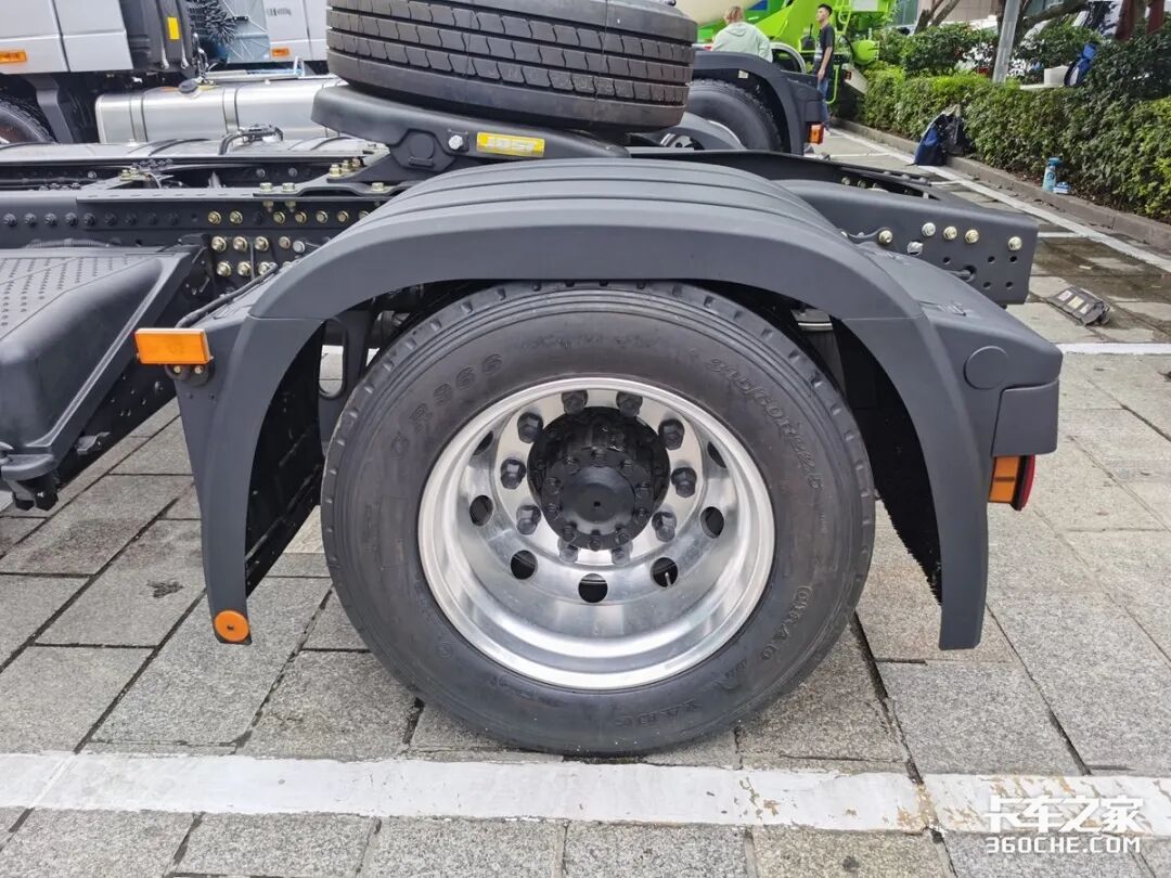 后桥采用了13吨的方盛小速比后桥,速比为2.389,从发动机、变速箱、车桥这个配置来看,这属于典型的大马力+直接挡+小速比的配置。这样的搭配具有传动效率高,相对经济车速快的特点,是未来高效物流的主流配置。另外能采用如此小的后桥速比,还有一个最主要的原因是这台车采用的是315/60R22.5的小轮胎。