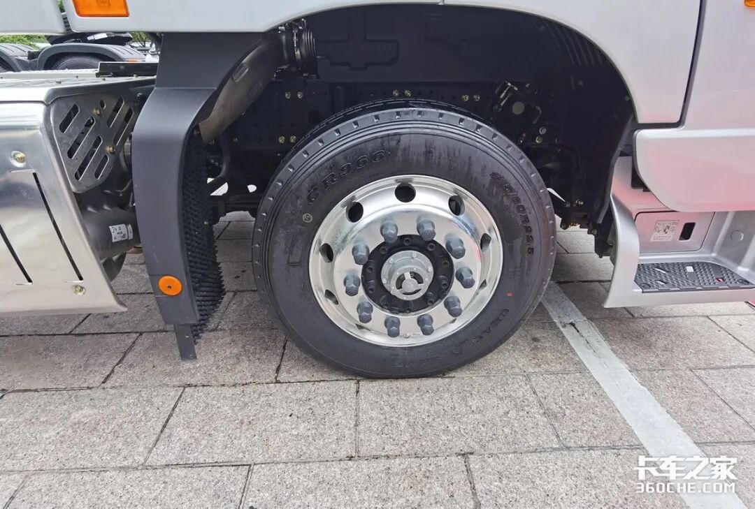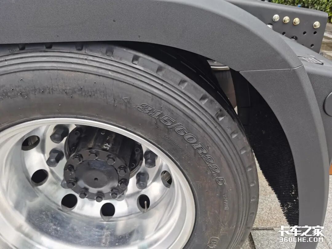 那这么低的高度是如何做到的呢?首先是采用了滚动半径更小的315/60R22.5的轮胎,相对于常见的12.00R22.5或者是295/80R22.5的轮胎,315/60R22.5的滚动半径更小。体现到整车上,315/60R22.5的高度比常规的要低15公分左右。
