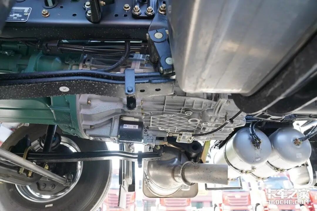 变速箱是全铝壳的解放传动的CA12TAX230手动变速箱,超速挡设计,最高挡速比为0.783。驱动桥采用了速比3.727的435轻量化后桥。