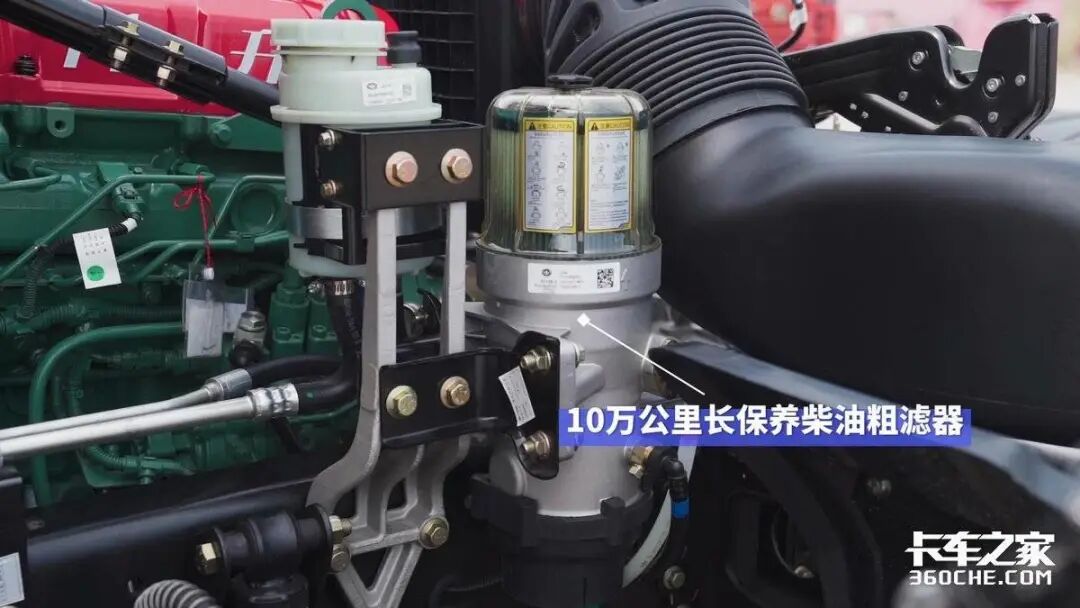 一般来说,我们日常运营的卡车加油渠道相对来说会比较复杂一点,油品也会参差不齐,这款一汽解放J6P经典版配备了10万公里更换滤芯的长保养柴油粗滤器,过滤精度可以达到10微米。它对水分的分离效率也比普通滤芯更高;同时还带加热功能。冬季防冻好启动。