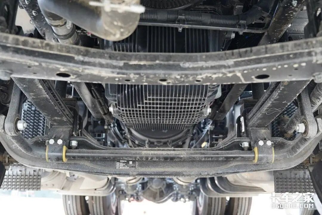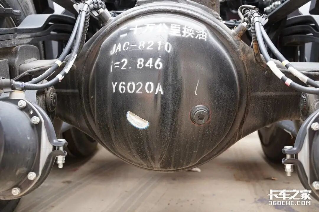 后桥部分,实拍车型的前桥为锻钢件、工字型断面;后桥为单级减速桥,速比为2.846(可选2.643速比)。搭配上整车匹配的12R22.5规格轮胎,实际测试下来该车的动机转速处于1100RPM时,车辆时速可轻松突破80km/h。