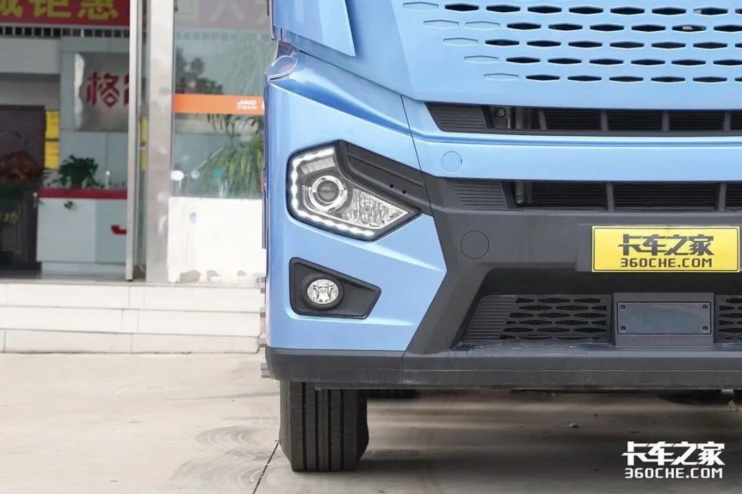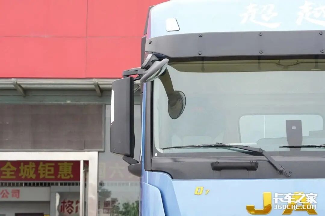 我们先看外观,介绍的这款超越Q7采用海蓝色涂装,光就这个配色就能感觉出其高贵华丽的气质。该车车头为采用非常圆润的设计,印有花体字“超越”的字样非常醒目,彰显其江淮重卡新品系车型。还有在前脸设计上,采用封闭式中网,减少了镀铬装饰,似乎更彰显金色车标“JAC”和“Q7”标志。
