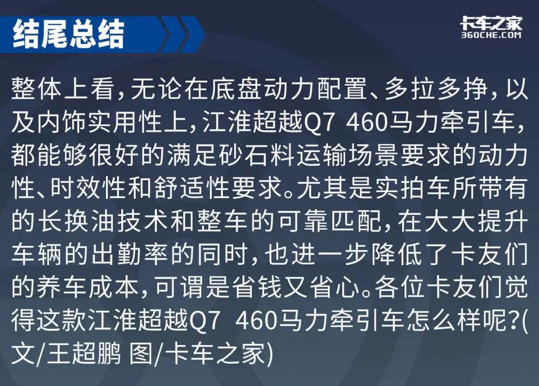 此外张师傅也表示,别以为倒短就不在意运营时效了,如果车辆动力好,起步快,那么就能比别多跑一趟,也是实实在在揣在兜里的收入。目前张师傅驾驶的是460马力江淮超越Q7车型,据他说正够用。