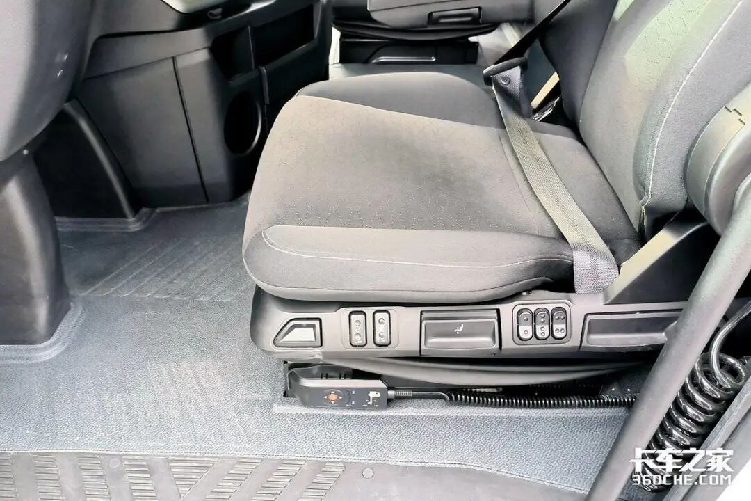 作为卡友们日常中接触时间最长的配置,座椅和卧铺表现就至关重要了,主驾驶位所配备的气囊减震座椅除了常规的高度、阻尼、腰部支撑调节以外,还带有座椅通风和座椅加热功能;座椅椅背还支持两段式调节,可以保障不同身材卡友的乘坐舒适度。在座椅下方,我们还能看到ECAS控制手柄,在车上就能轻松对悬架高度进行调节,非常方便。