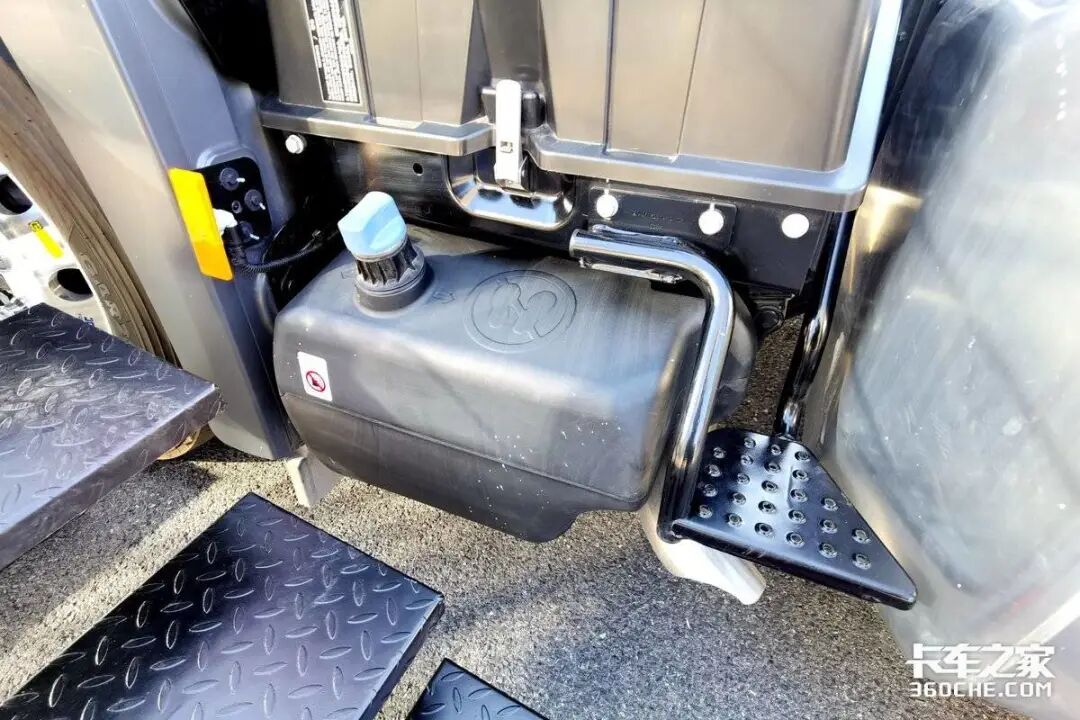 在底盘布局上,国产Actros表现较为紧凑和人性化。来到大梁左侧,电瓶、尿素箱采取上下交错的布局方式,尿素箱加注口位置较低,方便了卡友们手提尿素筒进行加注;同时在尿素箱与油箱间,该车还设计了一个蹬车踏板,配合上平台扶手可以很轻松登上平台进行操作,这些人性化设计底蕴深厚。