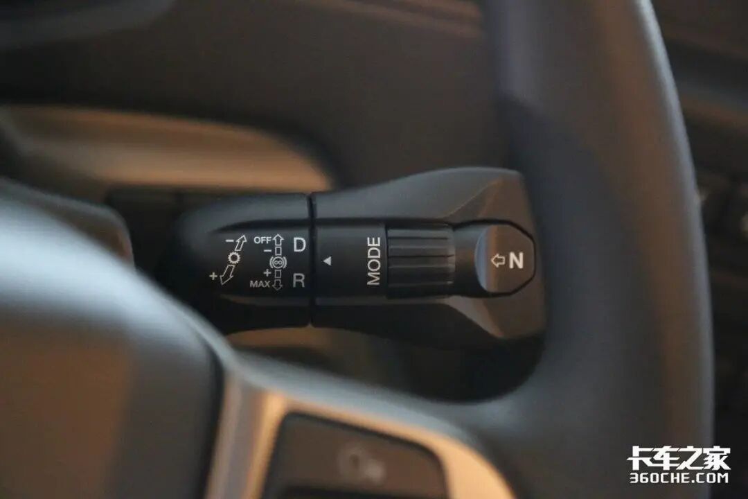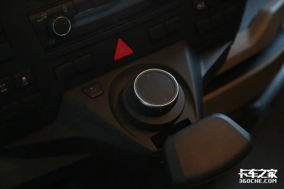 值得一提的是,这款TGX的换挡方式采用了怀挡设计,这也是怀挡在曼恩TGX车型上的首秀,换挡杆不仅集成了档位调节,液力缓速器的调节同样设计在换挡杆之上,需要注意的是,我们传统方式下拨挡杆的方式是控制液力缓速器的挡位,并不是切换变速箱挡位,需要扭动档位按键即可实现换挡。