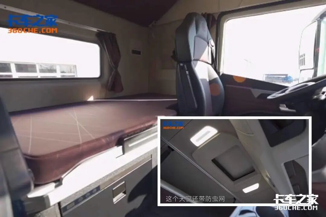 最后咱们再来看车辆的卧铺,鹰途商务舱的上下卧铺近乎等宽,都非常宽敞,标配的床垫也非常软和,躺上去秒睡没问题。在南方开车的卡友如果觉得开车闷的话,还能打开驾驶室顶部的天窗。
