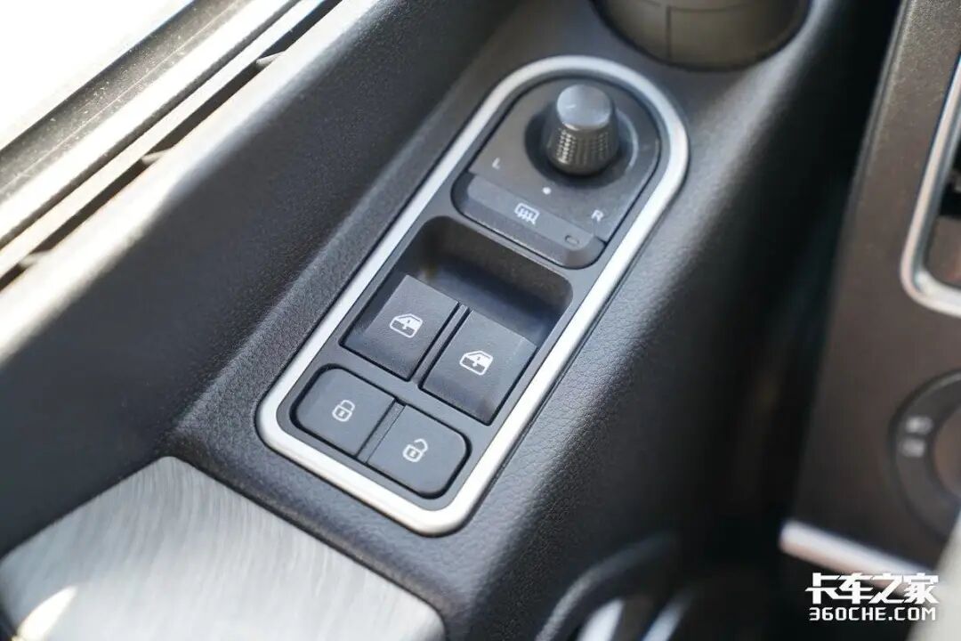 驾驶员左手边的车门窗处安置有车辆的中控锁、电动门窗以及后视镜电动调节电加热的按键,考虑到卡友们开夜车需要抽烟提神,车辆还标配有带鹰标的烟灰缸。
