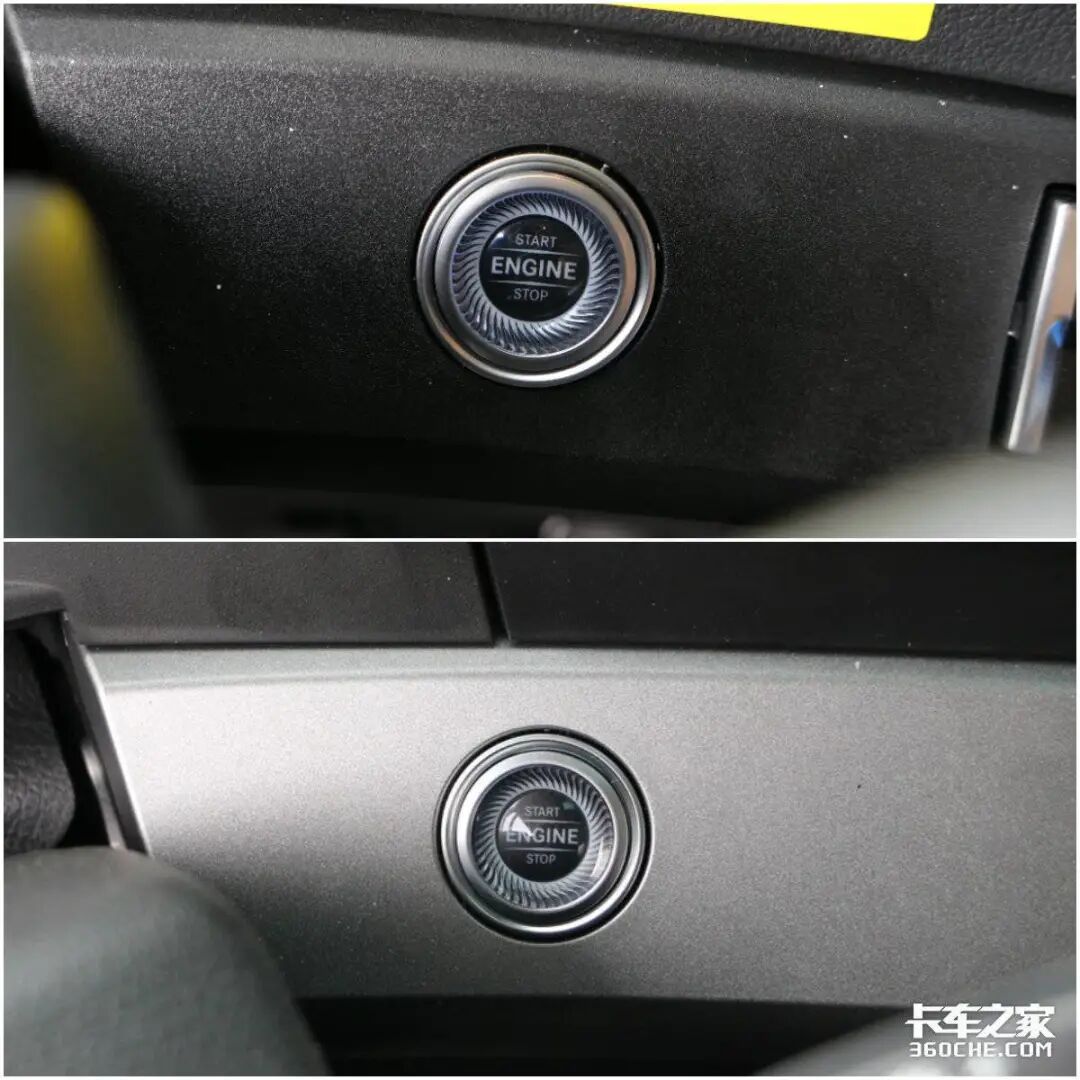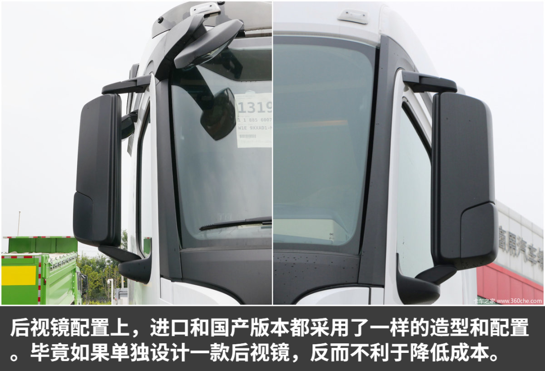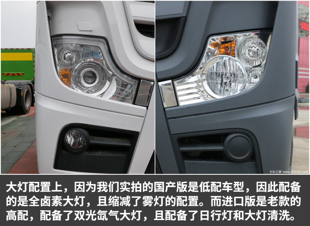 作为前脸区别最大的地方,国产版的进气中网相比进口版,最下面的格栅少了一层,进口版为5层,国产本为4层。另外我也看了其他国产版本的车型,不管是戴姆勒的发动机,还是康明斯的发动机车型,都是4层中网格栅。