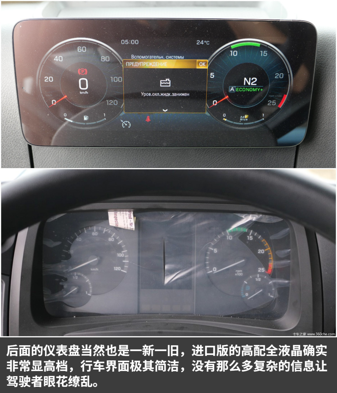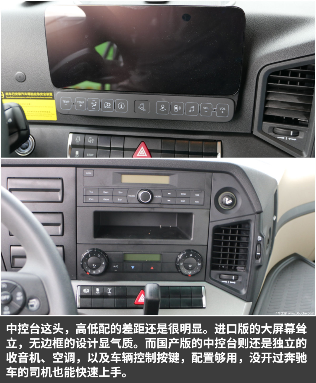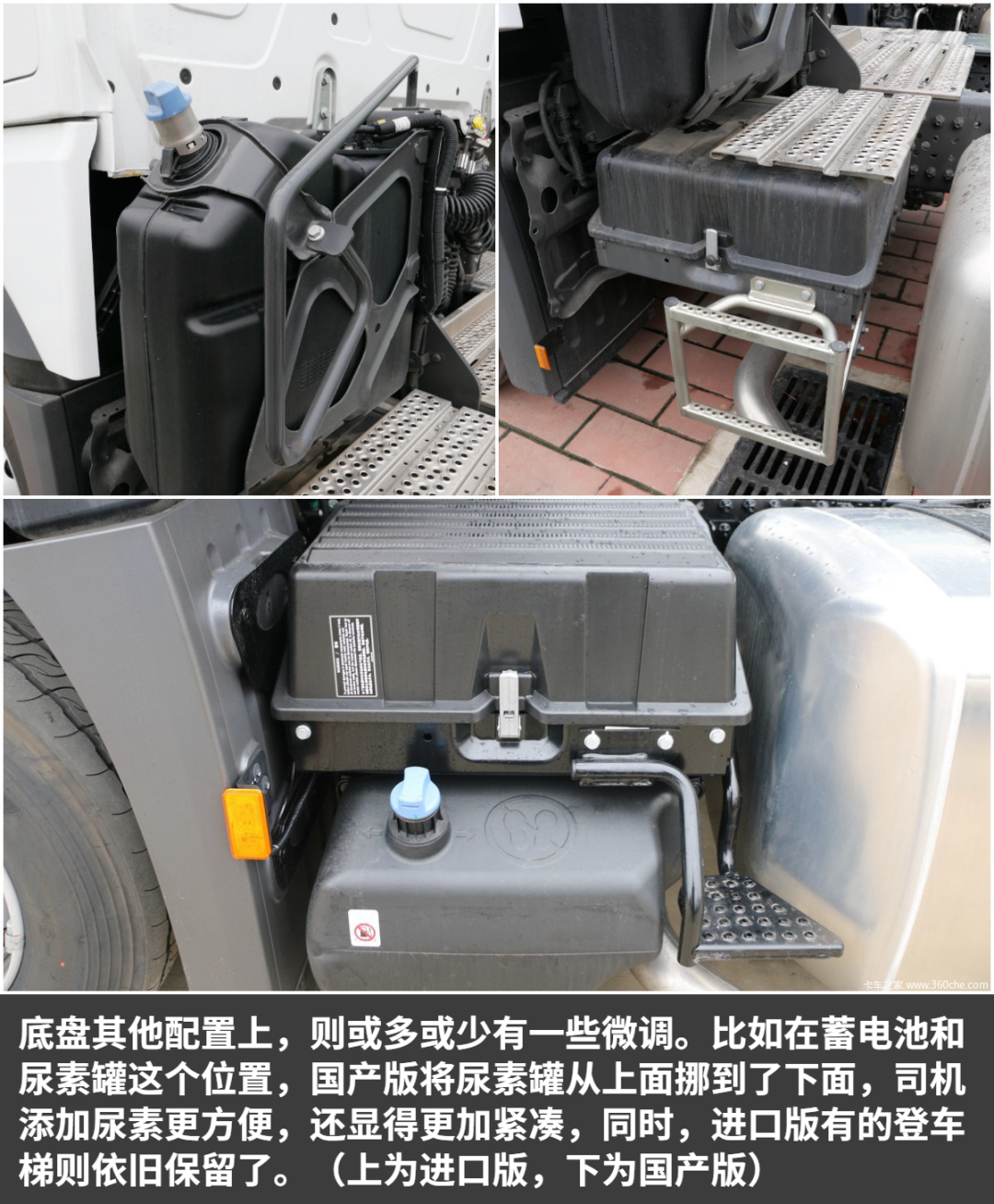 作为前脸区别最大的地方,国产版的进气中网相比进口版,最下面的格栅少了一层,进口版为5层,国产本为4层。另外我也看了其他国产版本的车型,不管是戴姆勒的发动机,还是康明斯的发动机车型,都是4层中网格栅。