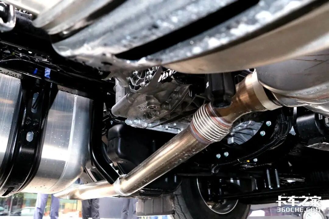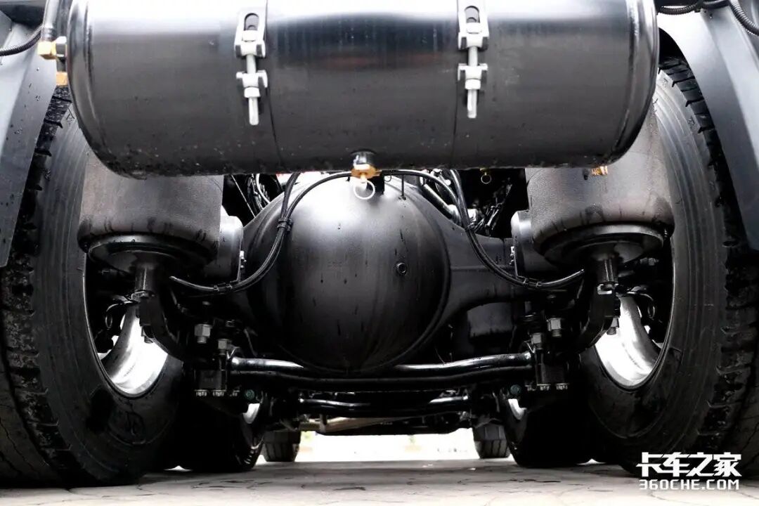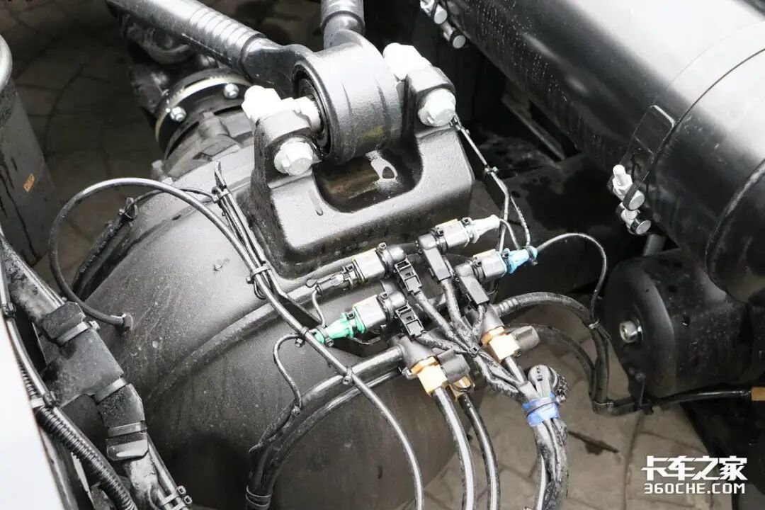 底盘内部集成了大量的储气筒、管线,排布走线比较清晰,同时在重要的发动机、变速箱支架位置也采用了轻量化的铝合金材质,用于帮助整车降重。