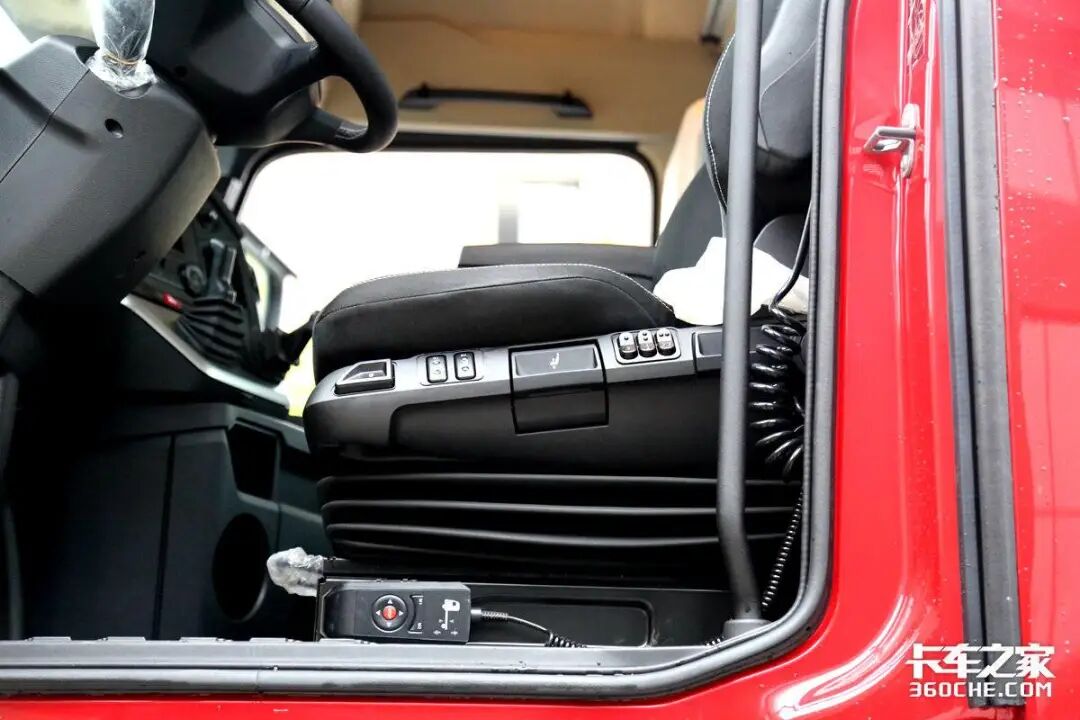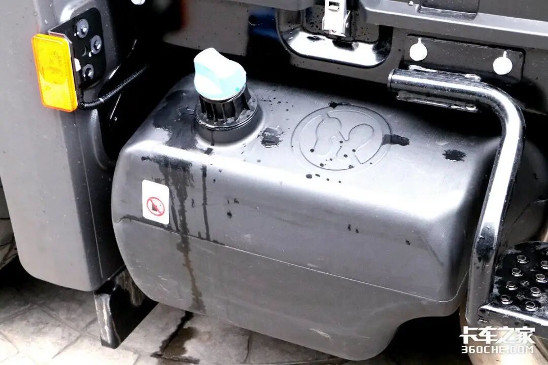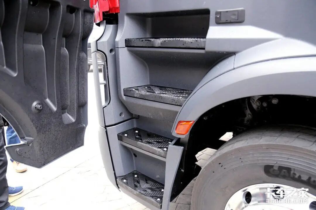新车将尿素罐集成在了启动电瓶组的下方,并且启动电瓶可配合蹬车踏板实现上车功能,可以踩踏,尿素罐的容积从进口版本的60升设计变为了如今90升的设计,在长距离运输工况下,减少加注频次,提升用车效率。而车辆油箱容积也有所提升,两侧相加共计990升,可满足超长距离的干线物流运输。