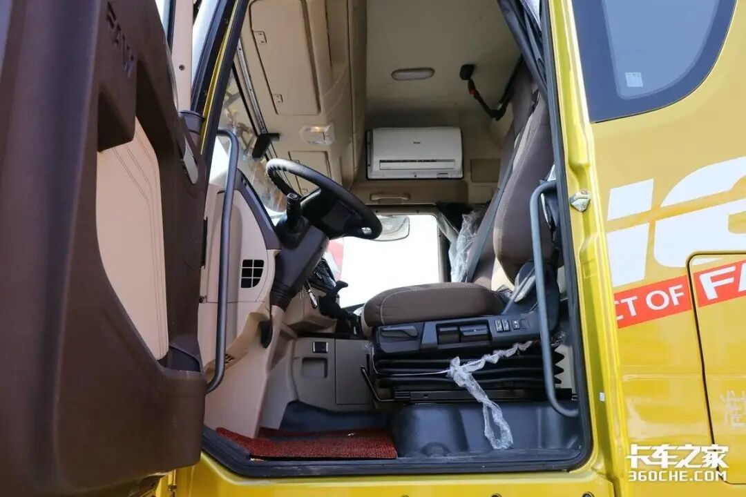 打开车门进入驾驶室,我们不难发现这款解放青汽JH6采用了高顶平地板大空间驾驶室,内部高度超过2米;值得一提的是,这款车驾驶室中间纵向空间较大,带来了非常不错的通过性,主副驾驶出入座位与卧铺间更加轻松方便。