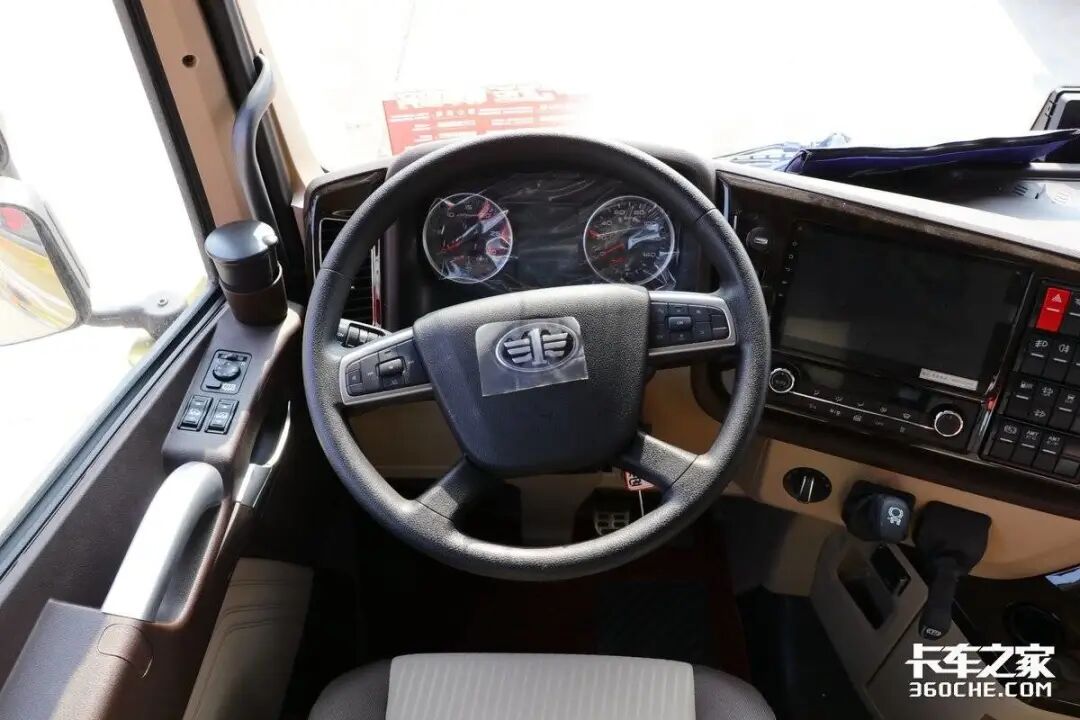 车辆方向盘采用了四幅式多功能方向盘的设计,仪表盘采用了我们卡友十分熟悉的机械指针+液晶屏的形式,左边为转速表和水温表,右边为时速表和油量表;更多的车辆信息通过中间的液晶屏幕来展现。