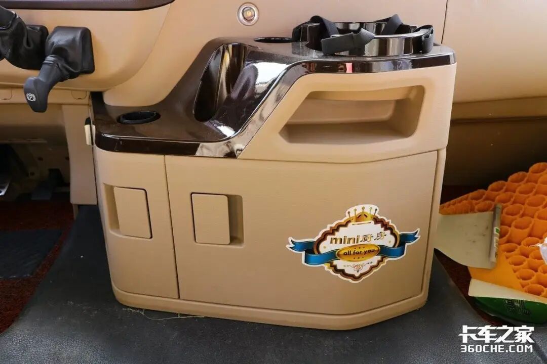 中控台下方设置了迷你厨房。在这里不仅可以存放随车携带的热水壶和零食。下方的储物柜也可以放置电饭锅,烧水壶以及一些卡友所需的食材,调料等物品。
