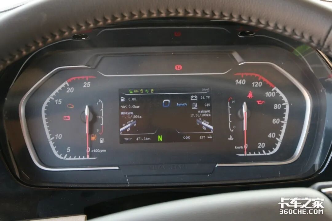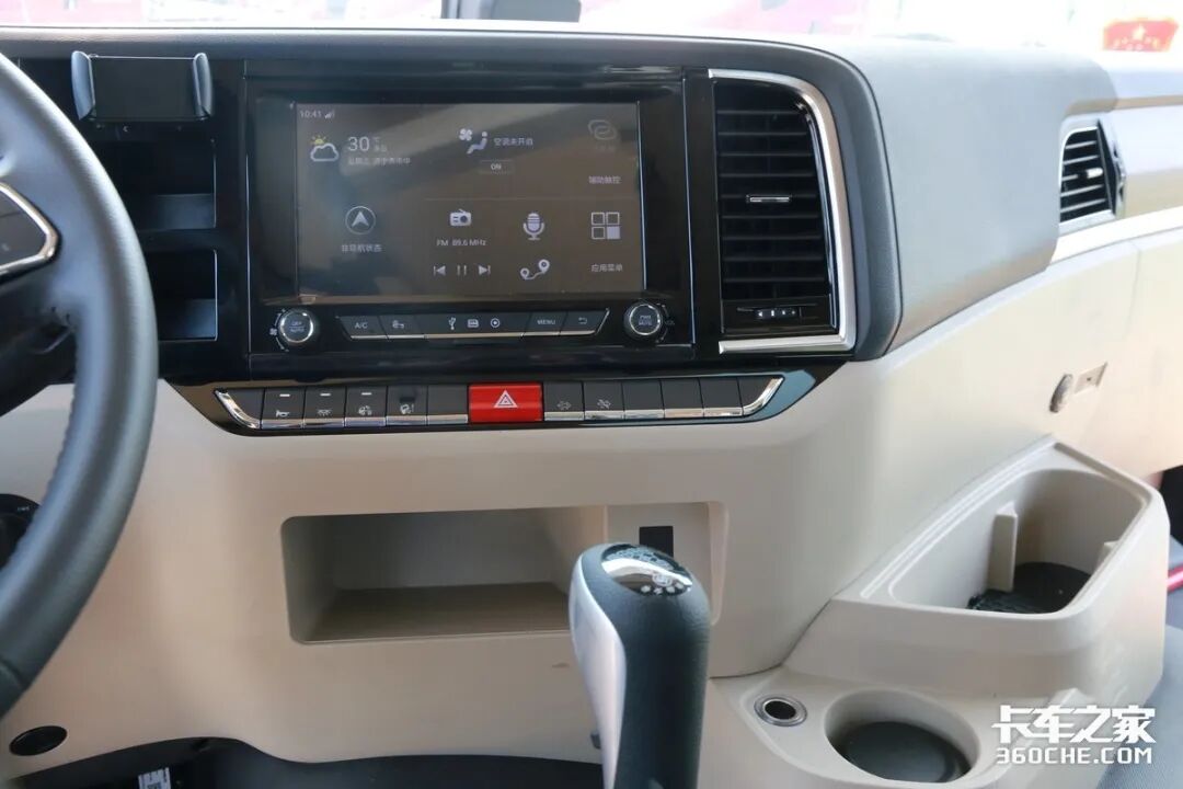 仪表盘并没有采用常规的圆形表盘设计,中间配置有一个彩色液晶屏,能够提供更加直观的车辆数据,通过多功能方向盘上的控制按键,可以实时查看车辆的各项信息。另外右侧的时速表采用逆时针设计,可能需要卡友多适应一下,不过中间的行车电脑也能提供车辆时速。
