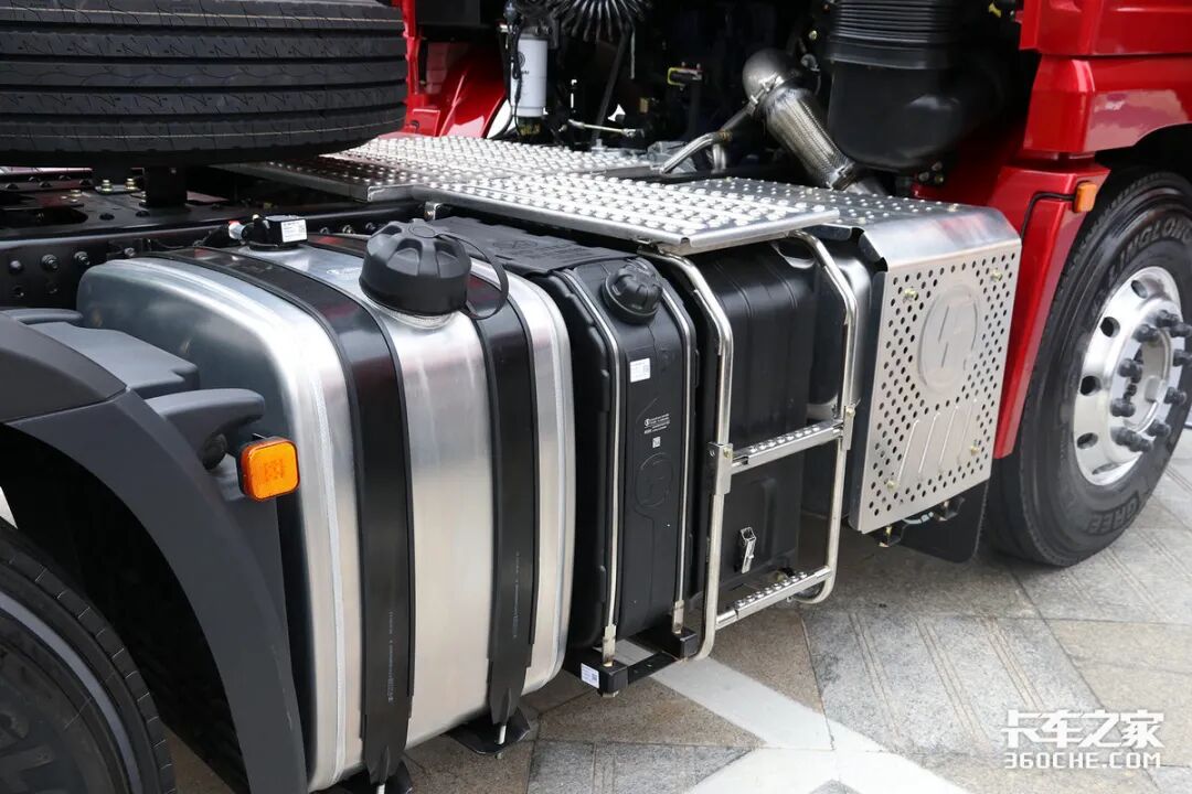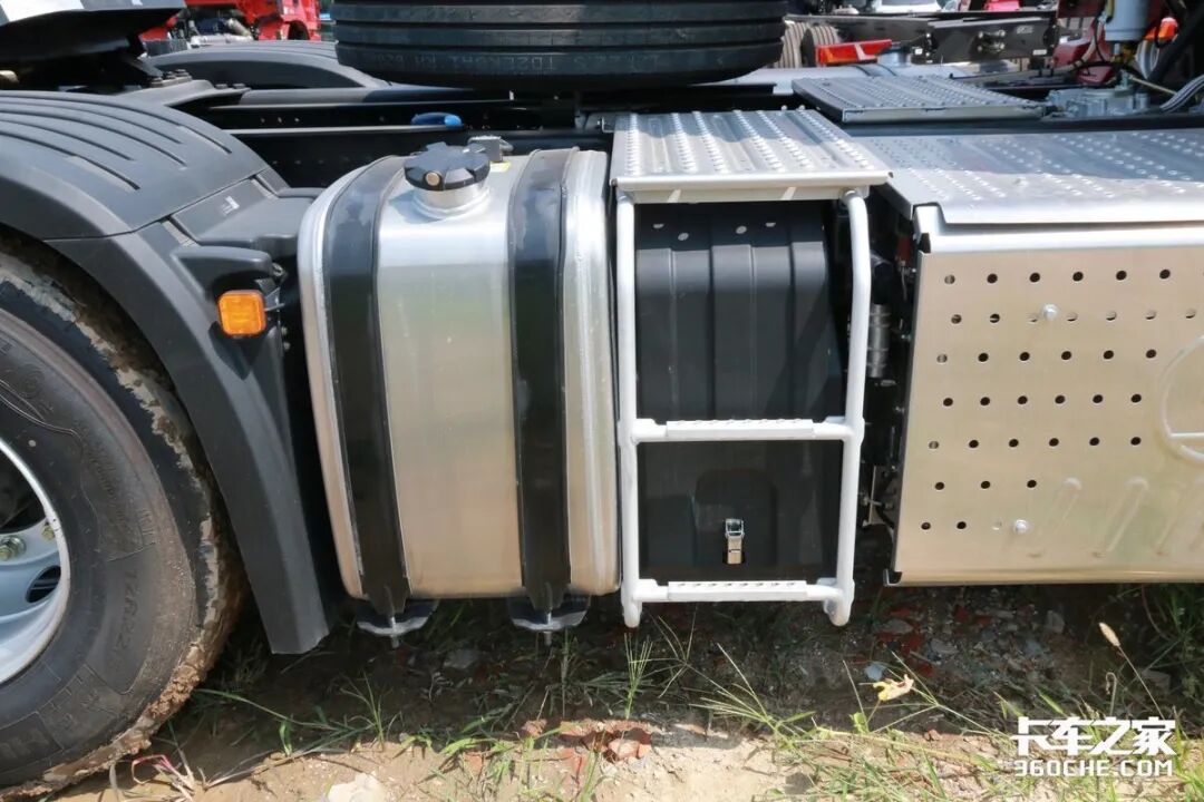 车架左侧布置有一个铝合金主油箱和尿素罐,可以看到尿素罐设计的非常薄,占用的空间也非常少,也会影响到罐体容积。而我们知道,国六阶段比国五尿素消耗更高,最好是随车备一些尿素,便于加注。从体型上来看,主油箱容积约800升左右。