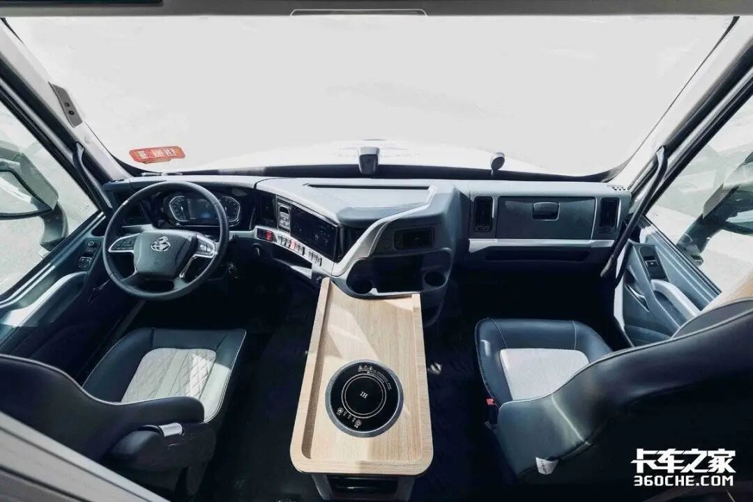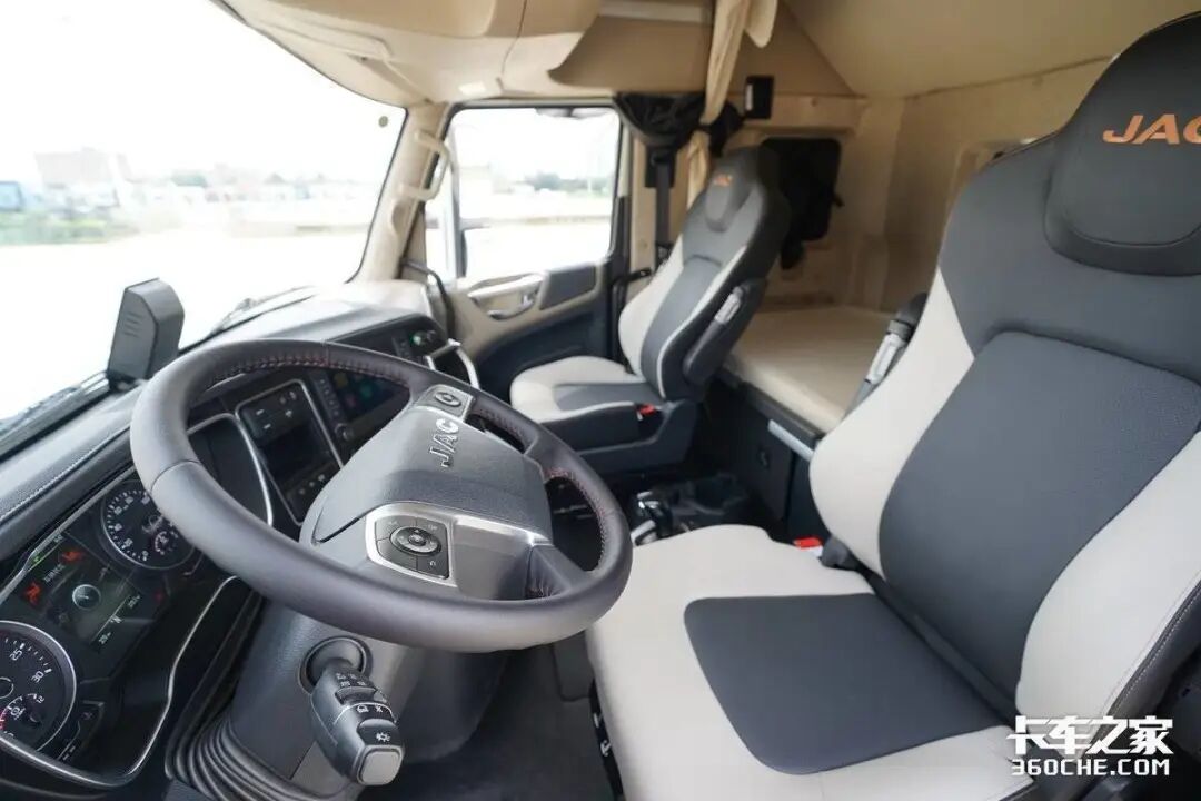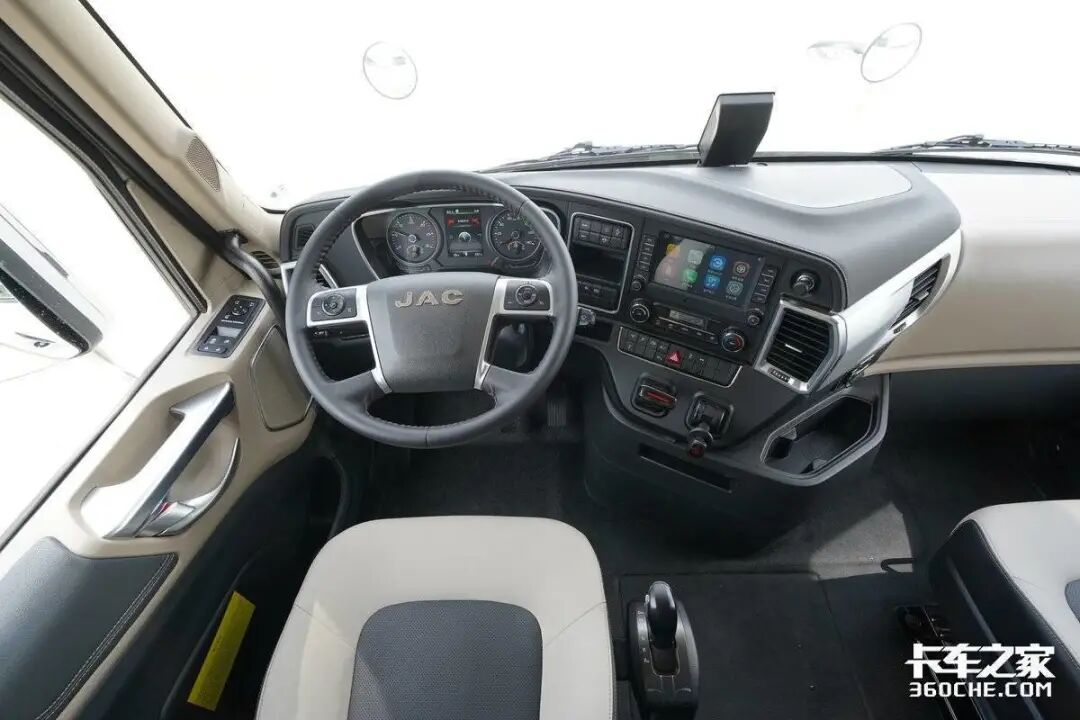 江淮重卡在驾驶室内的细节设计和配置上一向很扎实,质感很好,这款格尔发V7同样如此,多功能方向盘、气囊减震座椅、一键启动、电动调节电加热后视镜等一系列中高端配置当然都是标配。除此之外,中控台还带有一款大尺寸悬浮屏,内置功能也非常丰富。