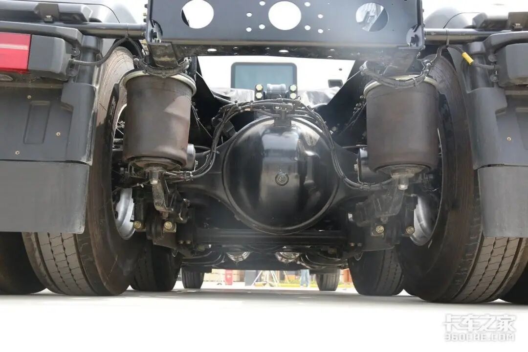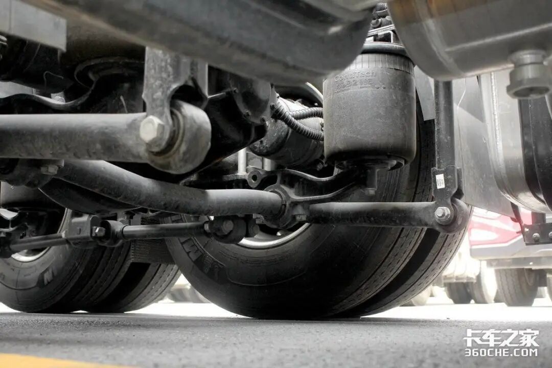 此外,这款车还配有福伊特液力缓速器,后桥采用的是东风德纳440后桥,速比为3.417,实拍的这款车后桥采用的是空气悬架,如今空气悬架在高端车型中的出镜率越来越高,尤其是在高价值、高效运输等细分市场中。