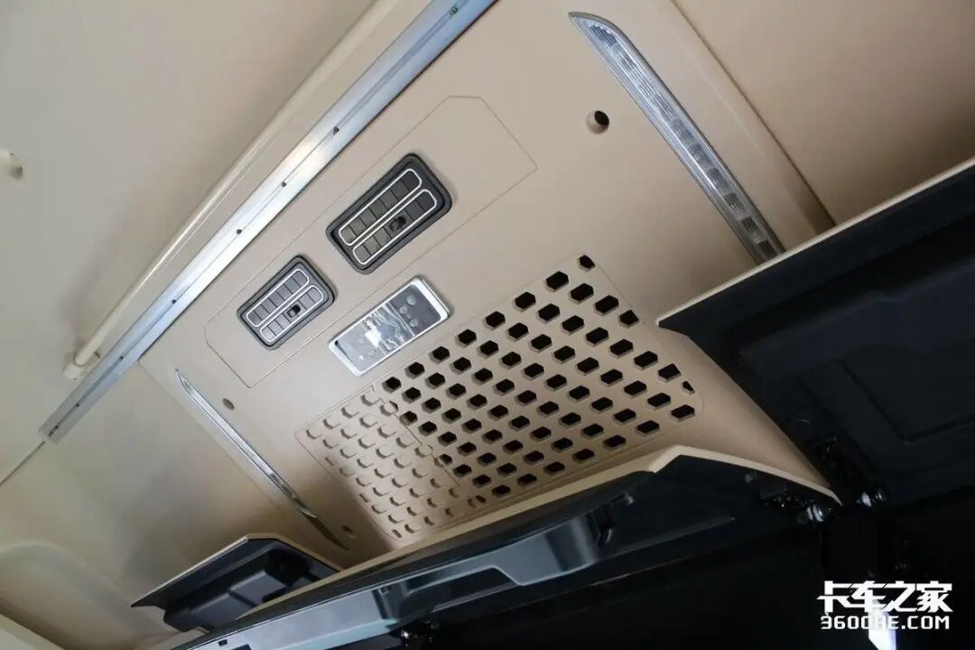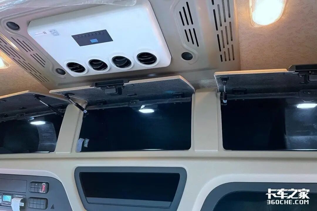 在其他功能配置上,悬浮双大屏实在是太吸引人眼球了,它们分别是悬浮式液晶仪表和悬浮式中控大屏,能显示平均油耗、驾驶得分等,还有货车导航、环绕影像、手机互联等功能。另外,该车还配置有多功能方向盘、旋钮式变速箱操作机构、原厂驻车空调、超大尺寸双卧铺及大容积冰箱等。