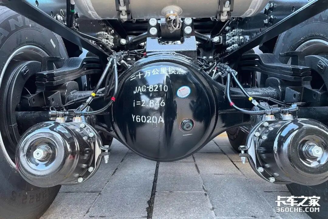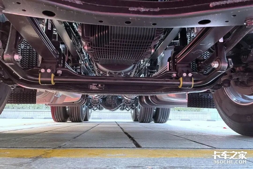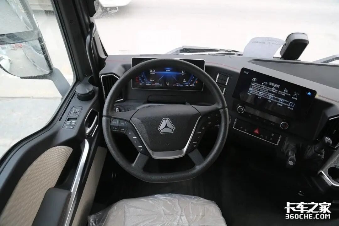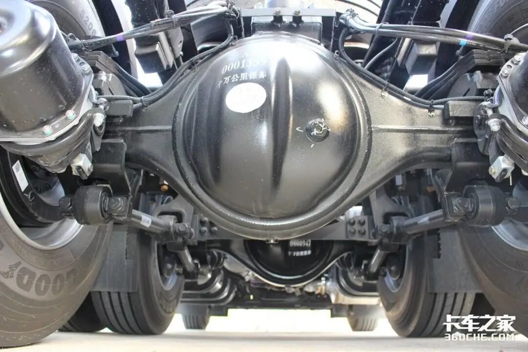 在底盘布局上,实拍车型采用重汽MCY12BGS后桥,速比为3.08,为了匹配不同的使用工况,还可以选择2.85和2.71速比。该车悬架是采用前2后3的少片簧、轻量化设计,当然,有需求的卡友也可以选择气囊悬架。还有在油箱匹配上,该车主油箱容积780升,副油箱容积220升,合计1000升,保守估计可以为这辆车提供3000公里左右的续航能力。