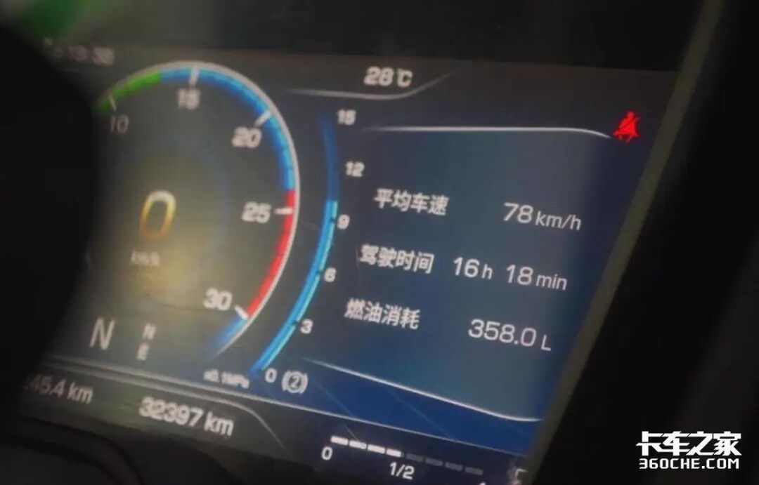 为了更好地测试车辆的实际油耗,赵大哥在发车之初为车辆加满了油,从出发装货到实际卸货的1245.4公里中,车辆的实际油耗控制在了百公里28.13L,整个里程共耗油358L,期间,车辆的平均时速为78km/h。