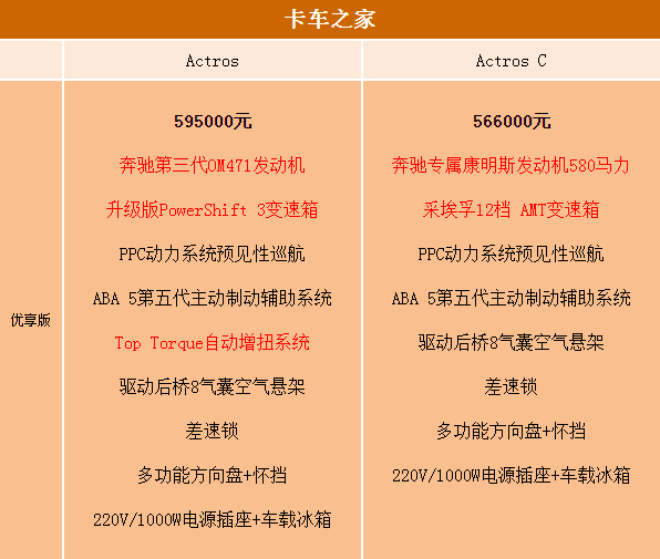 结合国产奔驰Actros和Actros C优享版车型595000元和566000元的价格,和它们拥有的高科技配置来看,这两款车型都拥有非常高的性价比。