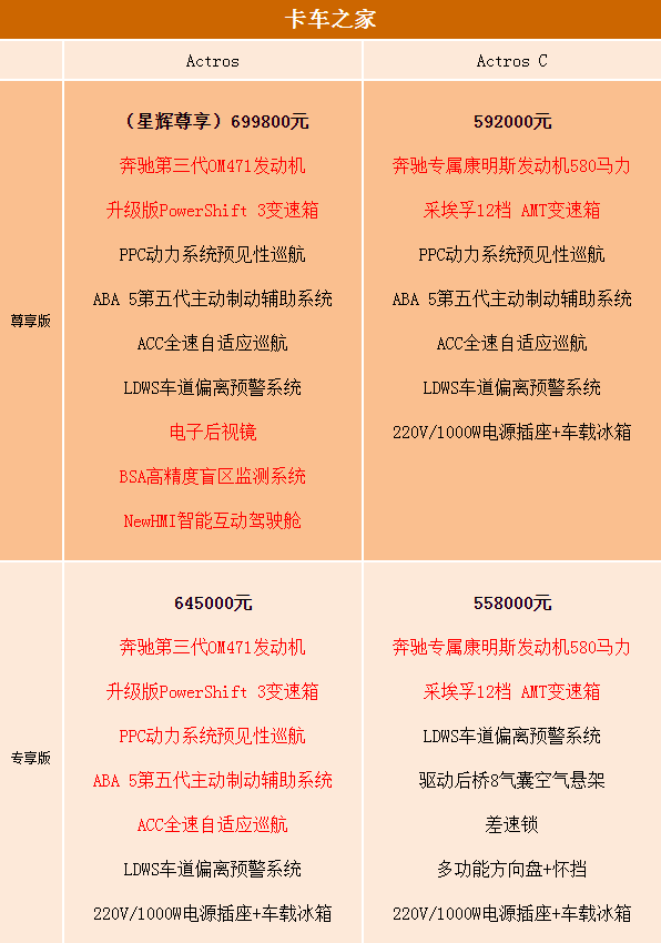 通过对国产奔驰Actros星辉尊享版和Actros C尊享版独有配置的分析,我们也能发现它们主要是“智能驾驶”和“科技安全”的尖端配置,对于追求“高端”“高配”的卡友来说更为合适。