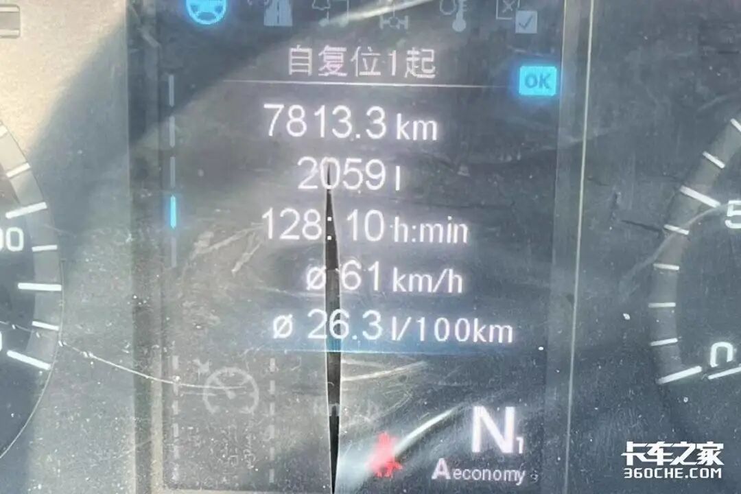 而根据阚先生实际运营后取得的油耗数据显示,在车货总重49吨的情况下,行驶7813公里共消耗燃油2059L,平均油耗为26.3L/100km,作为6×4驱动形式的牵引车来说,取得这样的成绩可以说是非常优秀了。在之前的采访中,阚先生曾表示在它的运输场景中能达到30个油以内就非常满意了,这样的油耗表现也超出了他的预期。