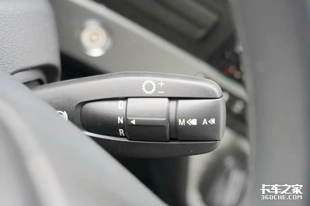 怀挡拨杆被安置在了方向盘的右侧,集成了前进挡、空挡、倒挡切换、手动/自动切换和发动机制动功能。首先在起步和倒车时,挂入相应的“D挡”和“R挡”后,我们不需要踩油门,车辆就会缓缓前进和倒退,它类似于乘用车的操作模式,让我们在跟车、倒车时,能更加轻松的操控车辆。