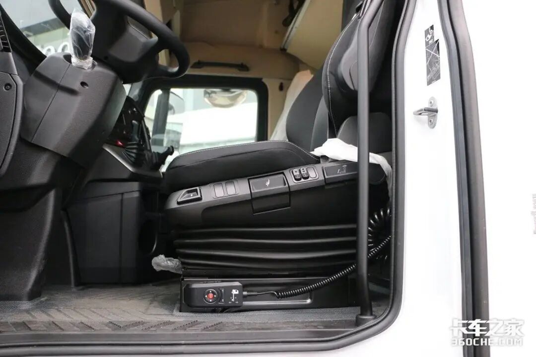 作为卡友们日常中接触时间最长的配置,座椅和卧铺表现就至关重要了,主驾驶位所配备的气囊减震座椅除了常规的高度、阻尼、腰部支撑调节以外,高配车型还带有座椅通风和座椅加热功能、座椅椅背还支持两段式调节,可以保障不同身材卡友的乘坐舒适度。在座椅下方,我们还能看到ECAS控制手柄,在车上就能轻松对悬架高度进行调节,非常方便。