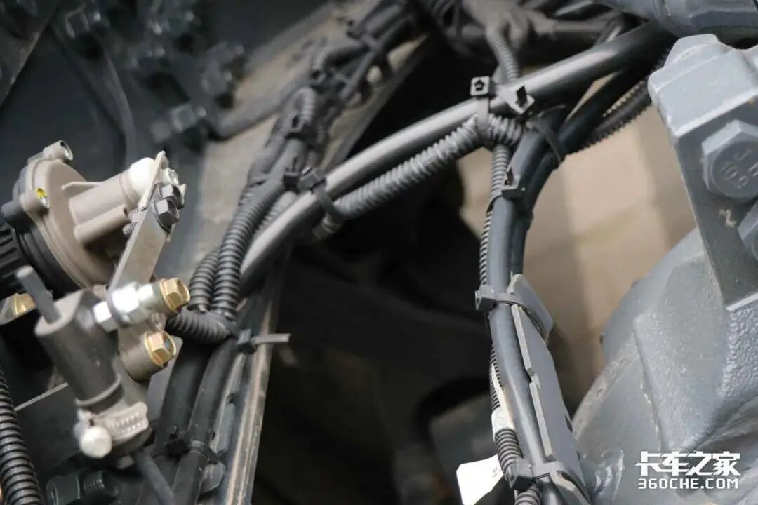 在细节方面,红岩杰狮H6欧标版同样经得起推敲。首先我们可以看到车辆大梁内部的线束走向非常的规整,不仅排列整齐,并且在脆弱线束外缘还包裹有塑料保护套,其次,车辆的接线阀口所采用的螺栓以及螺母均为铜质金属,抗腐蚀性以及耐磨性可见一斑。
