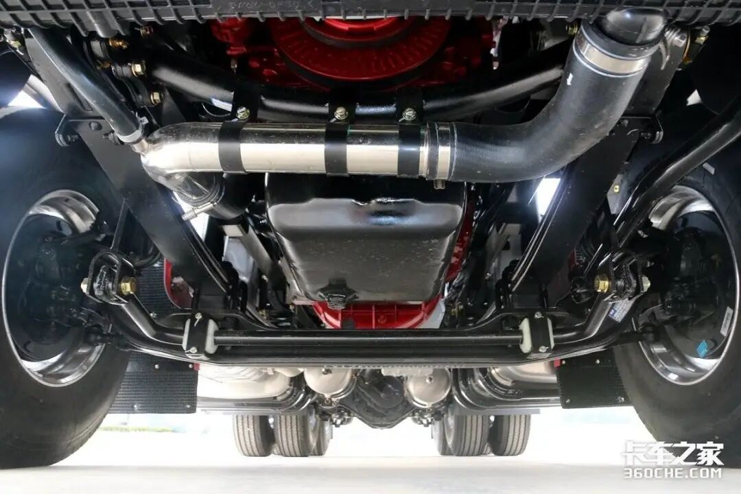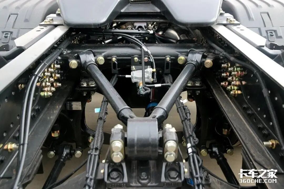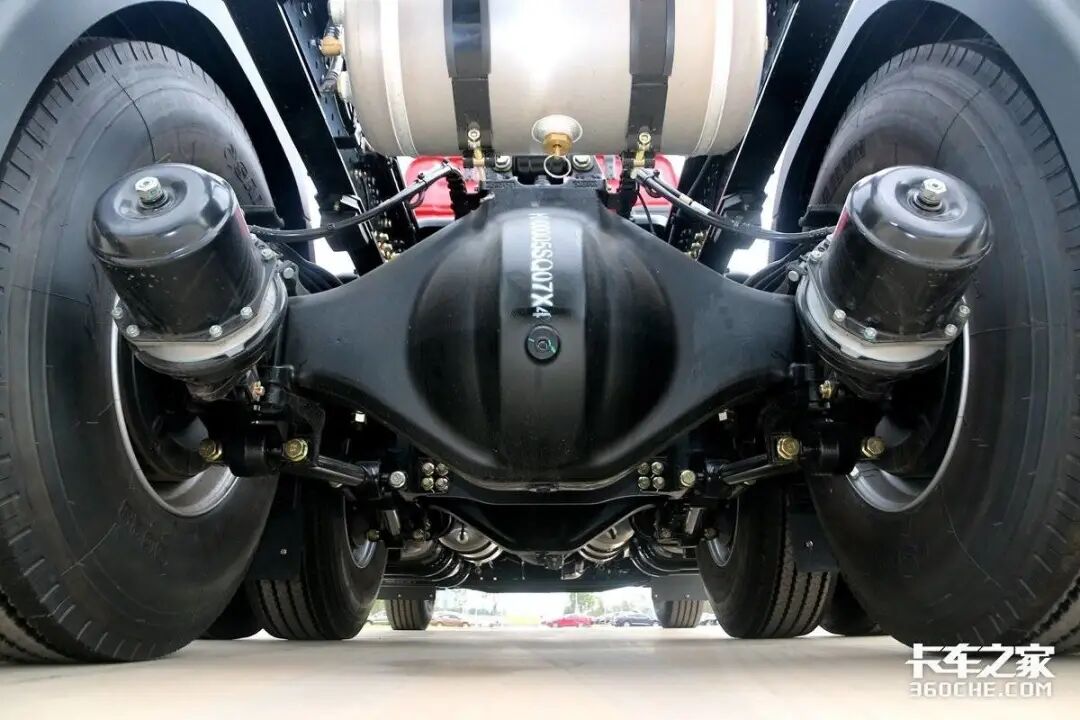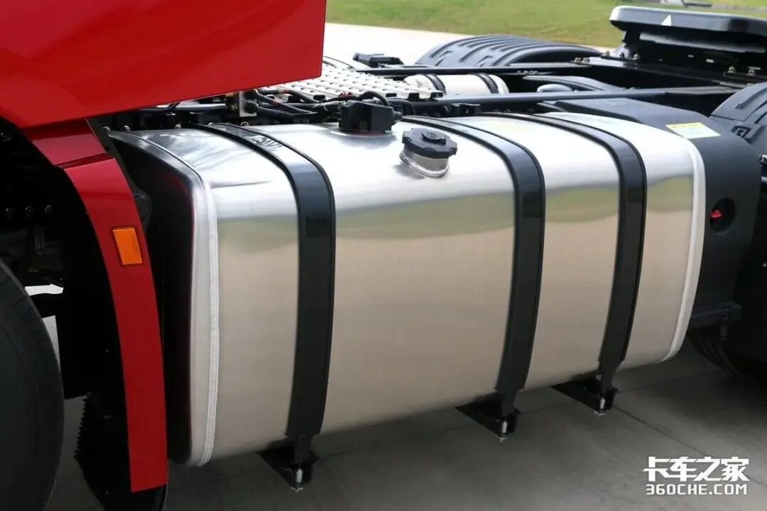 在续航方面,实拍车型采用双油箱设计,其总容积达到1000L(700L+300L),能为该车提供3000公里以上的超长续航里程。另外,该油箱还是采用铝合金材质壳体,很好的降低了底盘自重。