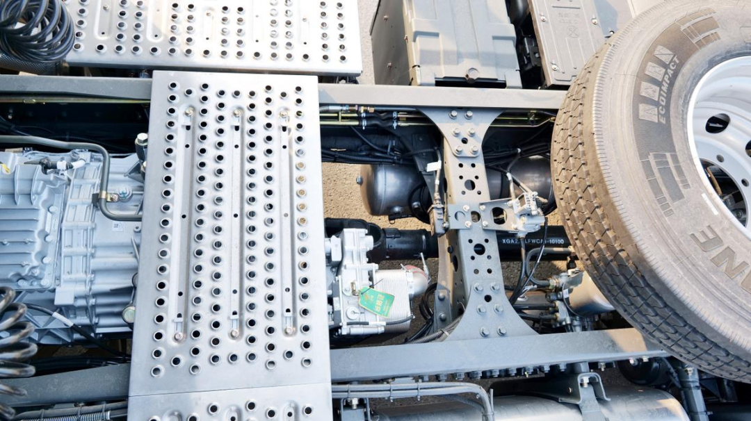 后桥方面,车辆搭载方盛440后桥,速比可选2.846/3.083/3.364/3.7。这款后桥不仅具备极高的传动效率和低速比能力,30万公里免维护,同时轻量化效果不俗,据厂家介绍,新一代车桥通过对主减速器、铝合金轮毂的重新设计,整体减重达到了123.6公斤,能做到减重的同时材料升级更有牢固。