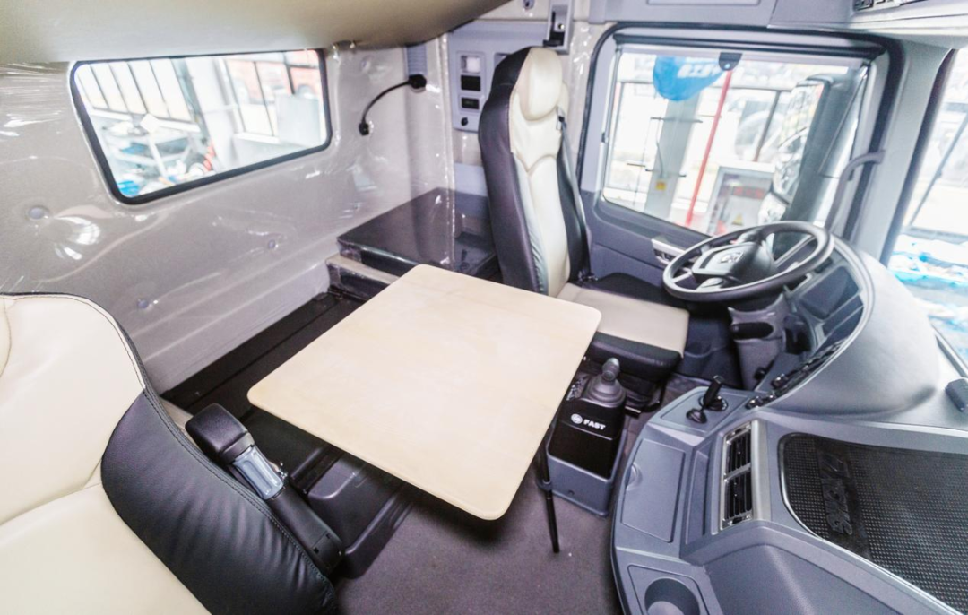 打开车门进入内饰,我们可以发现这款徐工智卡W550采用了高顶宽体平地板的设计,内高超2米。整体空间感表现十分优秀,主副驾切换、座椅卧铺切换均可以轻松实现。