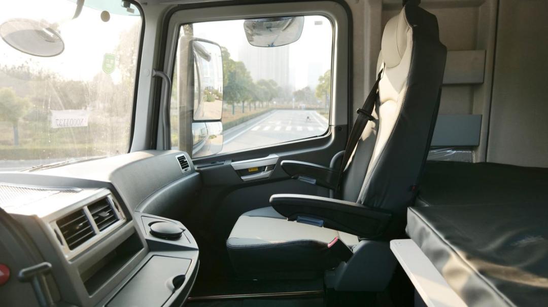 驾驶室采用四点全浮气囊减震设计,还配备有全气囊三级减震系统、ECAS电控空气悬架;再加上集按摩设计、气囊减震、电动加热为一体,并且带有一键充放器,以及9挡高度调节,两段式腰部支撑的气囊座椅等诸多舒适性配置,可以极大地缓解长途驾驶时卡友产生的疲劳感。