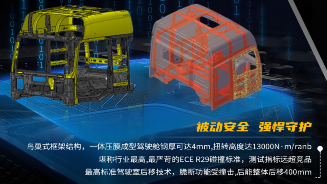 值得一提的是,这款徐工智卡W550采用了鸟巢式的笼式骨架、一体成型框架结构驾驶室,材料采用的是一种ST16高强度钢板,框架用钢最厚可达4MM,扭转高度达到了13000Nm/ranb;并且具备“最高标准”的驾驶室后移技术,脆断功能受撞击后能整体后移400MM,并且车辆也通过了ECE R29碰撞标准。强大的被动安全设计足以守护我们卡友的日常行车安全。