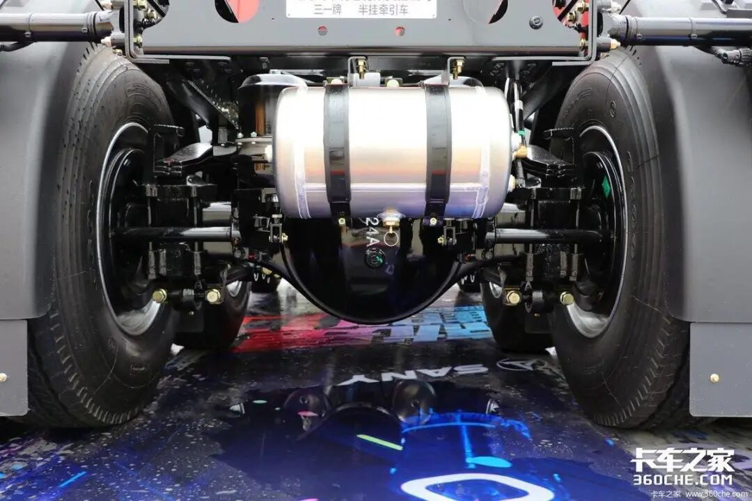 底盘部分,这台车选择的是速比为2.867的HY420驱动桥,整车装配有规格为12R22.5的佳通轮胎,底盘两侧装配有一大一小共计940L容积的两个铝合金油箱,整车可选装后桥8气囊悬挂。