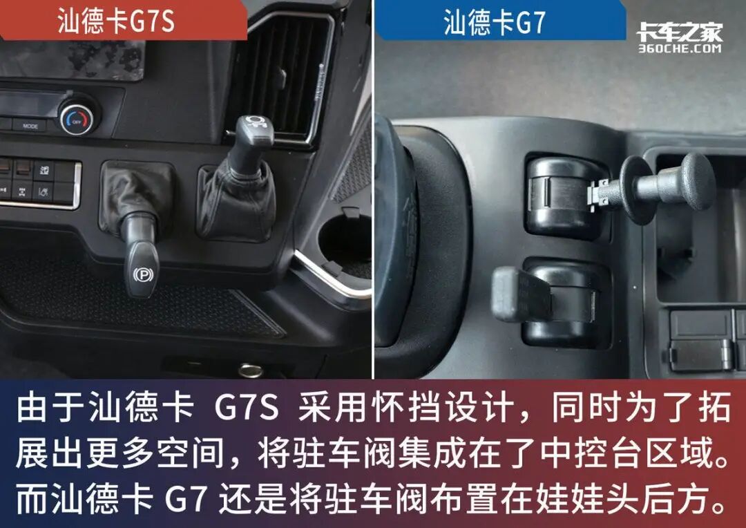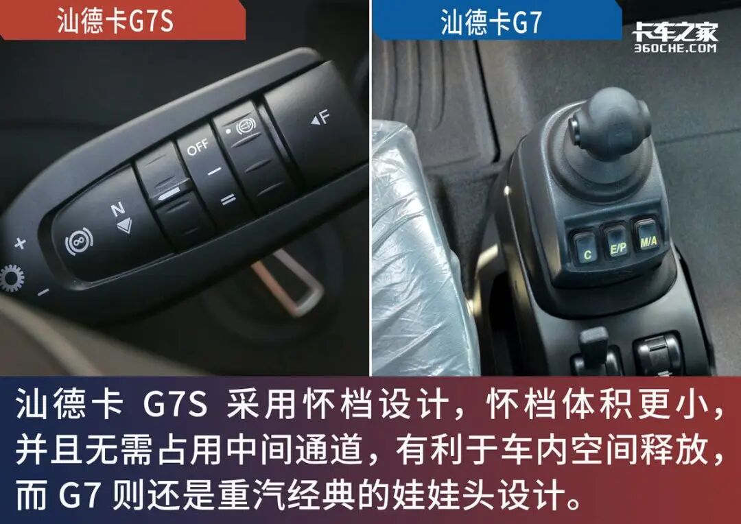 汕德卡G7S右侧拨杆集成换档机构、缸内制动和缓速器开关,不仅驾驶员操作起来非常便捷,同时还能拓展车内空间,也是很多进口车上常见的设计。汕德卡G7则是我们熟悉的重汽娃娃头换档机构,操作起来也很简单。