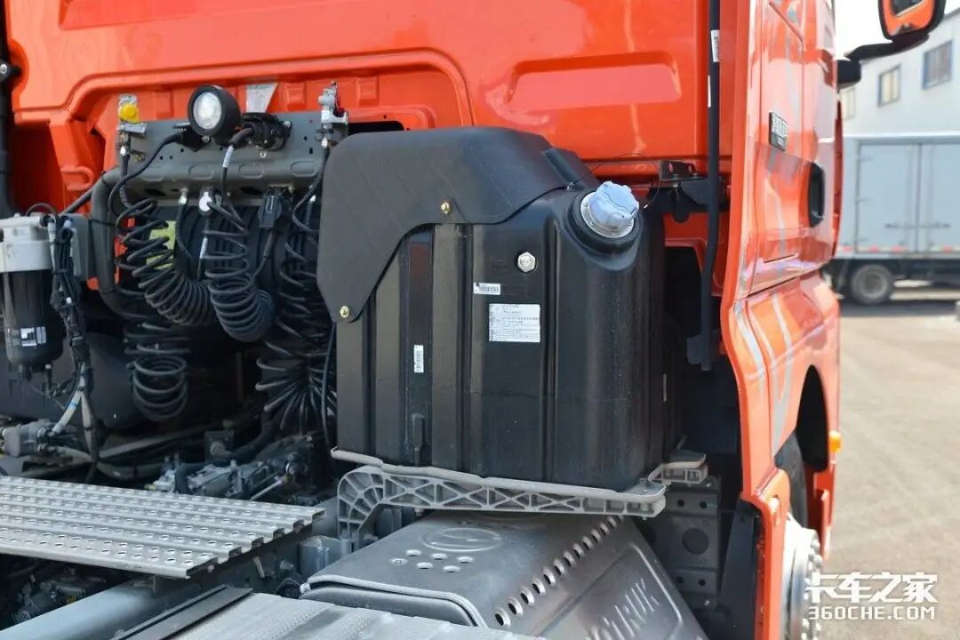 实拍汕德卡G7将尿素罐布置在驾驶室后方,其好处在于不用抢车架两侧的空间,还可以把尿素罐容积设计的更大。不过卡友自己在添加尿素的时候,可能就没有那么方便。